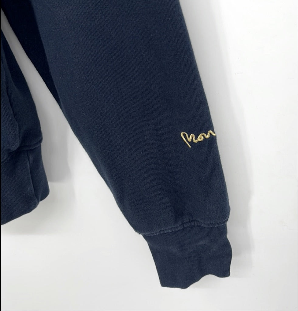 Money Big Sig Trifill Crew Neck Sweatshirt In Navy A ribbed crew neck and ribbed cuffs on the long sleeves with a stretch ribbed waistband. The large signature Money logo is printed on chest in navy black gold and pink with an additional large signature Money logo printed on the reverse also in navy black gold and pink. The signature embroidered Money logo features on the right sleeve above the cuff in gold. The signature woven Money Sig Ape pinch tag is sewn on the reverse left of the waistband in black and white with an additional Money Logo pinch tag on the right side seam in black and grey—100% Cotton.