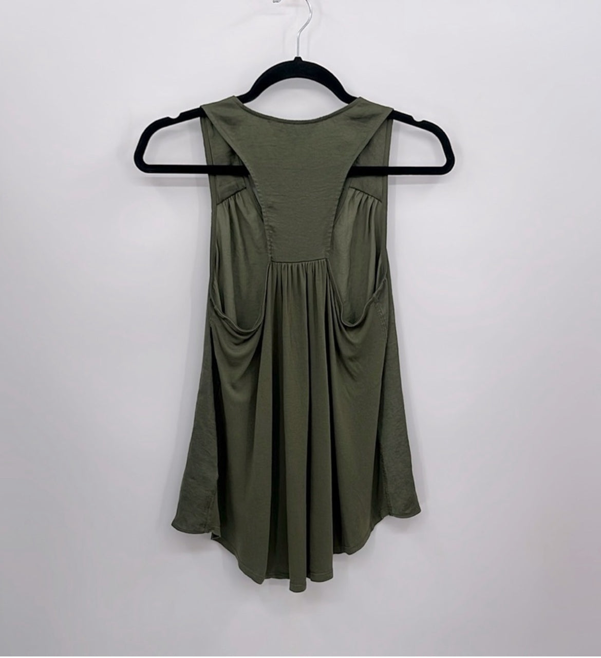 This tank top features studs on the straps and is made with a combination of polyester and rayon materials. It is available in size small and has approximate measurements of 18 inches pit to pit and 25 inches in length. It is in great pre-owned condition.