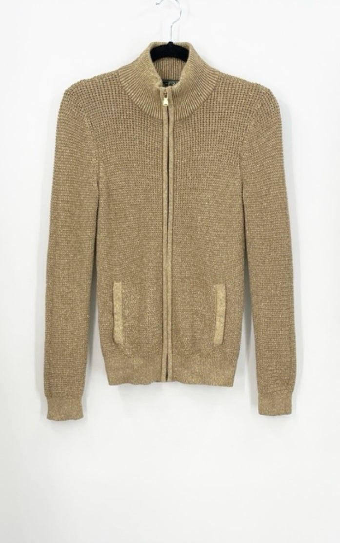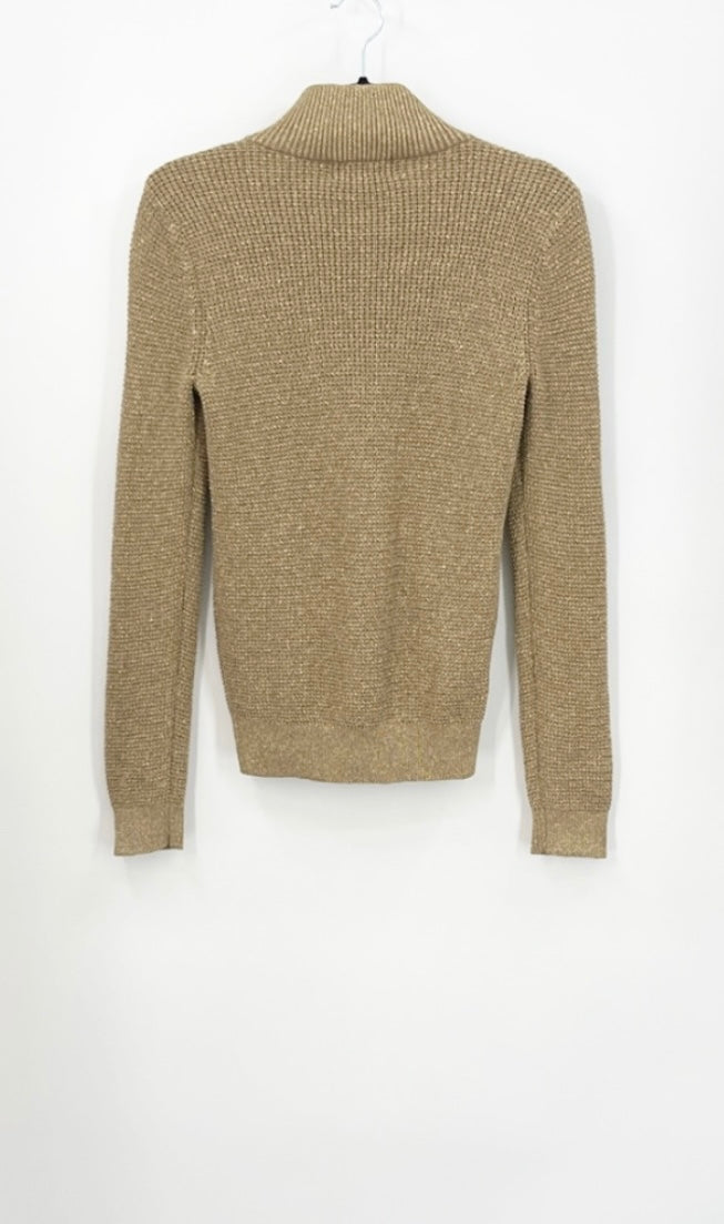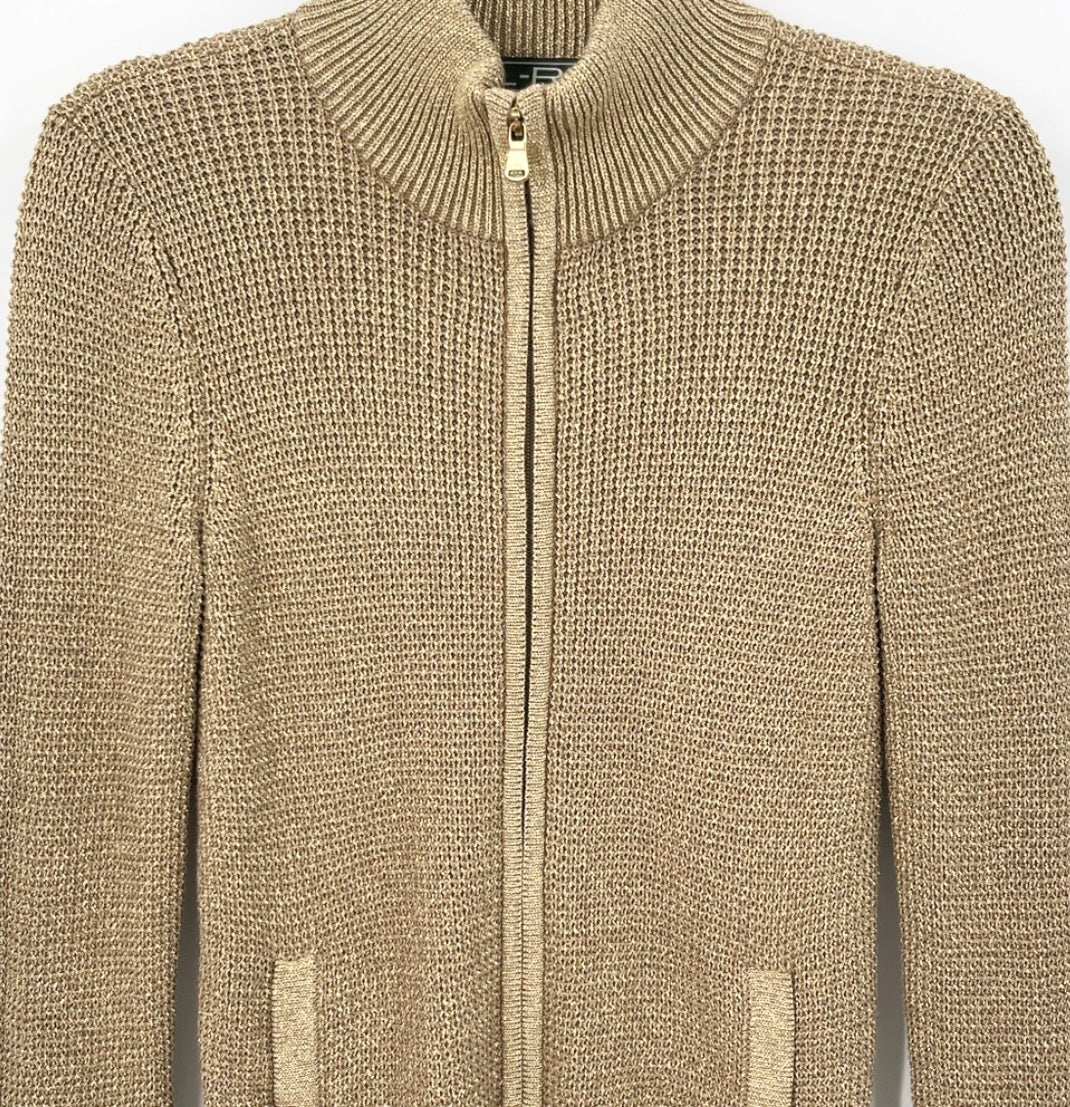 This gold metallic sweater by Lauren Ralph Lauren features a mock-neck, zip-up design with front pockets. It is made of 67% cotton, 21% polyester, and 12% metallic, and is available in size small. The approximate measurements are 17 inches (stretchable up to 19 inches) across the chest , and a length of 25 inches. It is in great pre-owned condition.