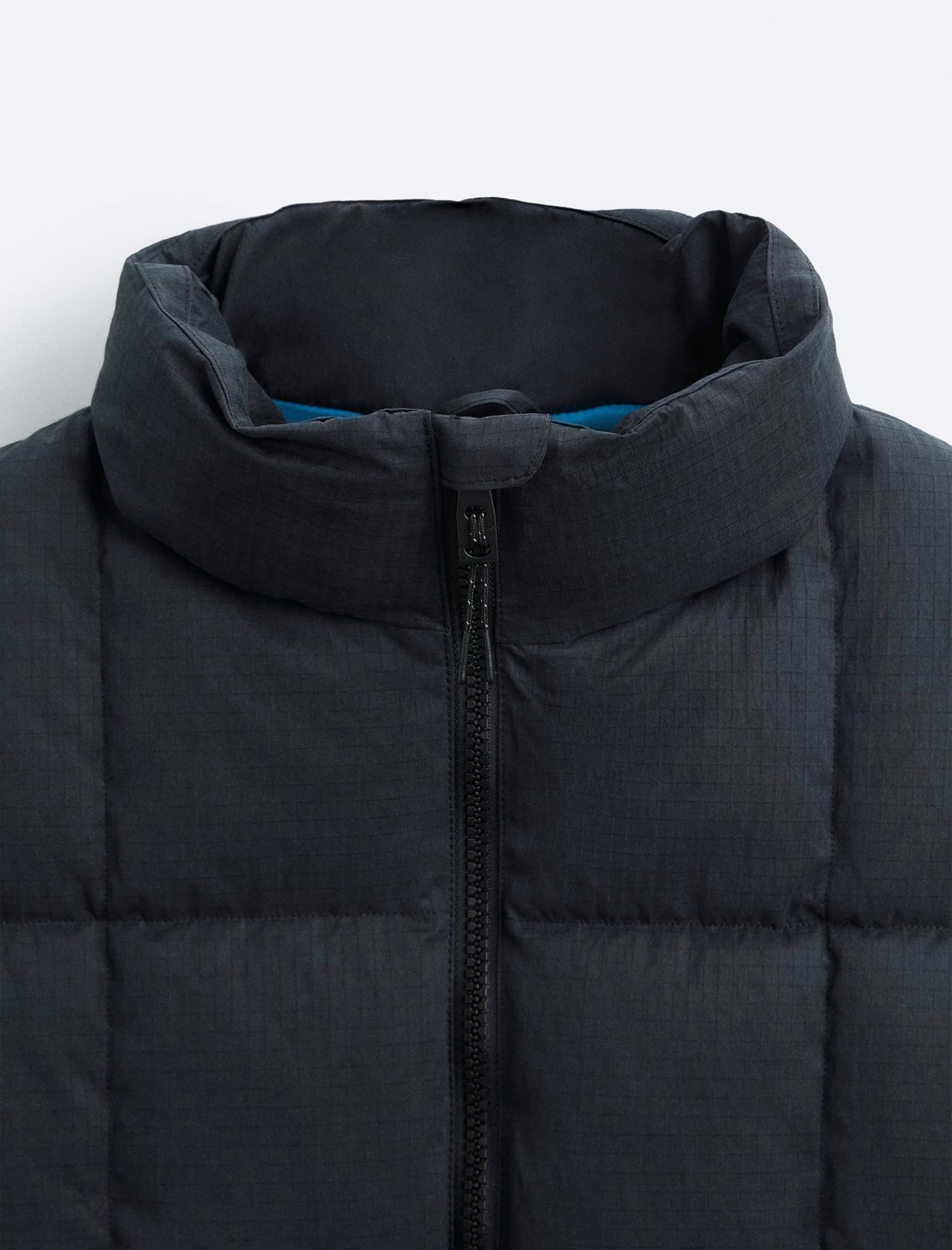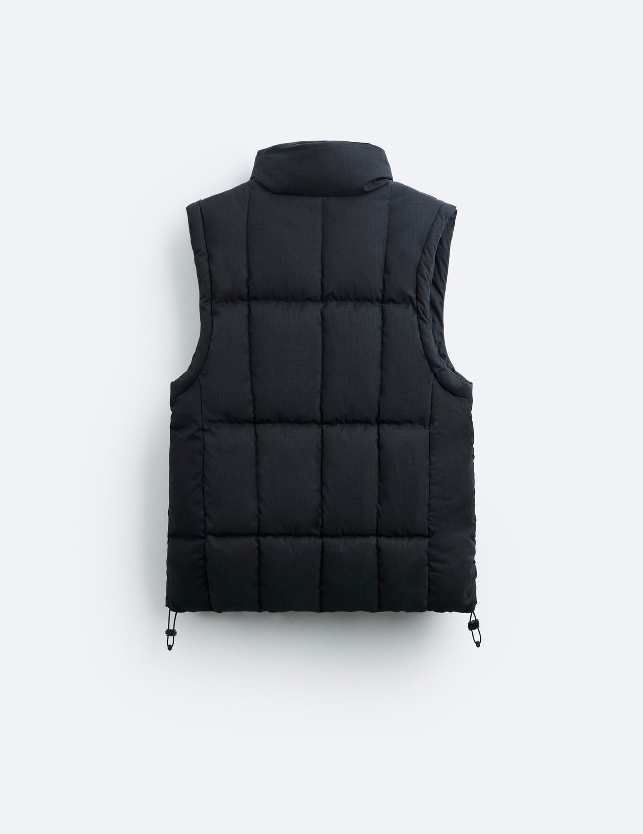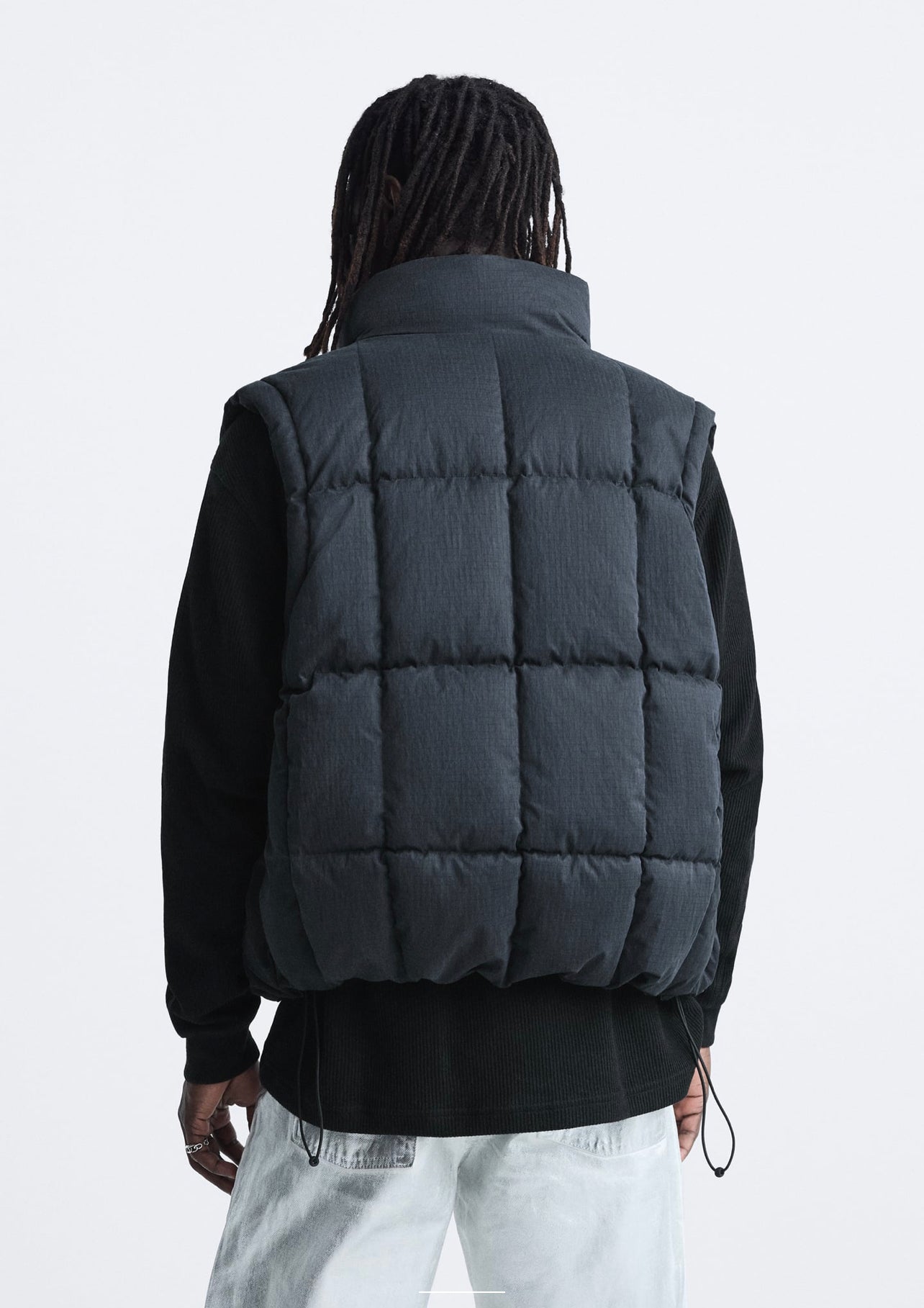 Le gilet Zara Puffer est confectionné dans un tissu ripstop texturé et résistant aux déchirures. Il présente un modèle sans manches avec un col haut, des poches zippées sur les hanches, un ourlet réglable avec des élastiques latéraux et une fermeture zippée sur toute la longueur sur le devant. La coque extérieure est composée de 59 % de polyester et 41 % de polyamide, tandis que le tissu secondaire est de 53 % de polyester et 47 % de polyamide. La doublure et le rembourrage sont 100 % polyester.