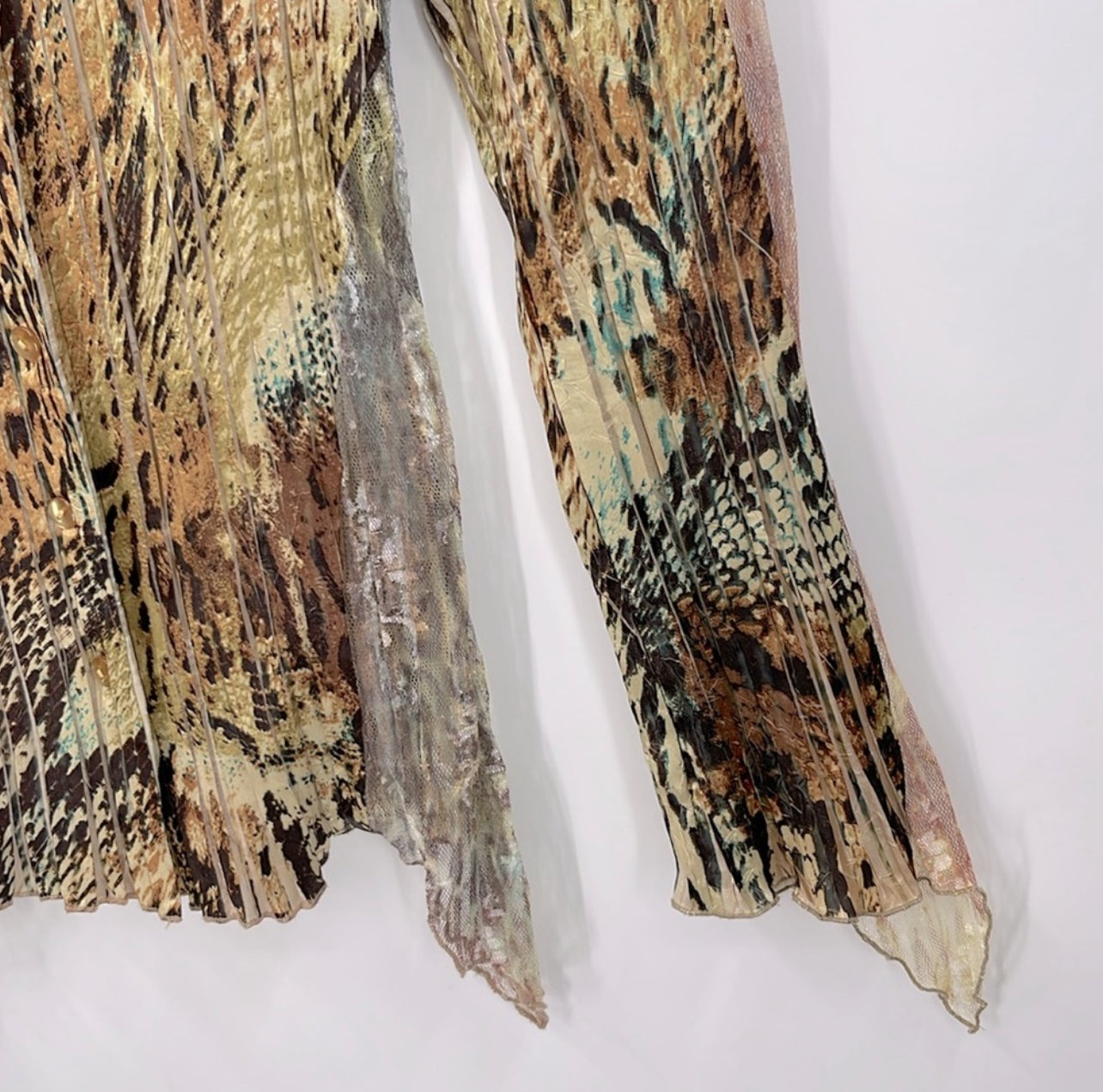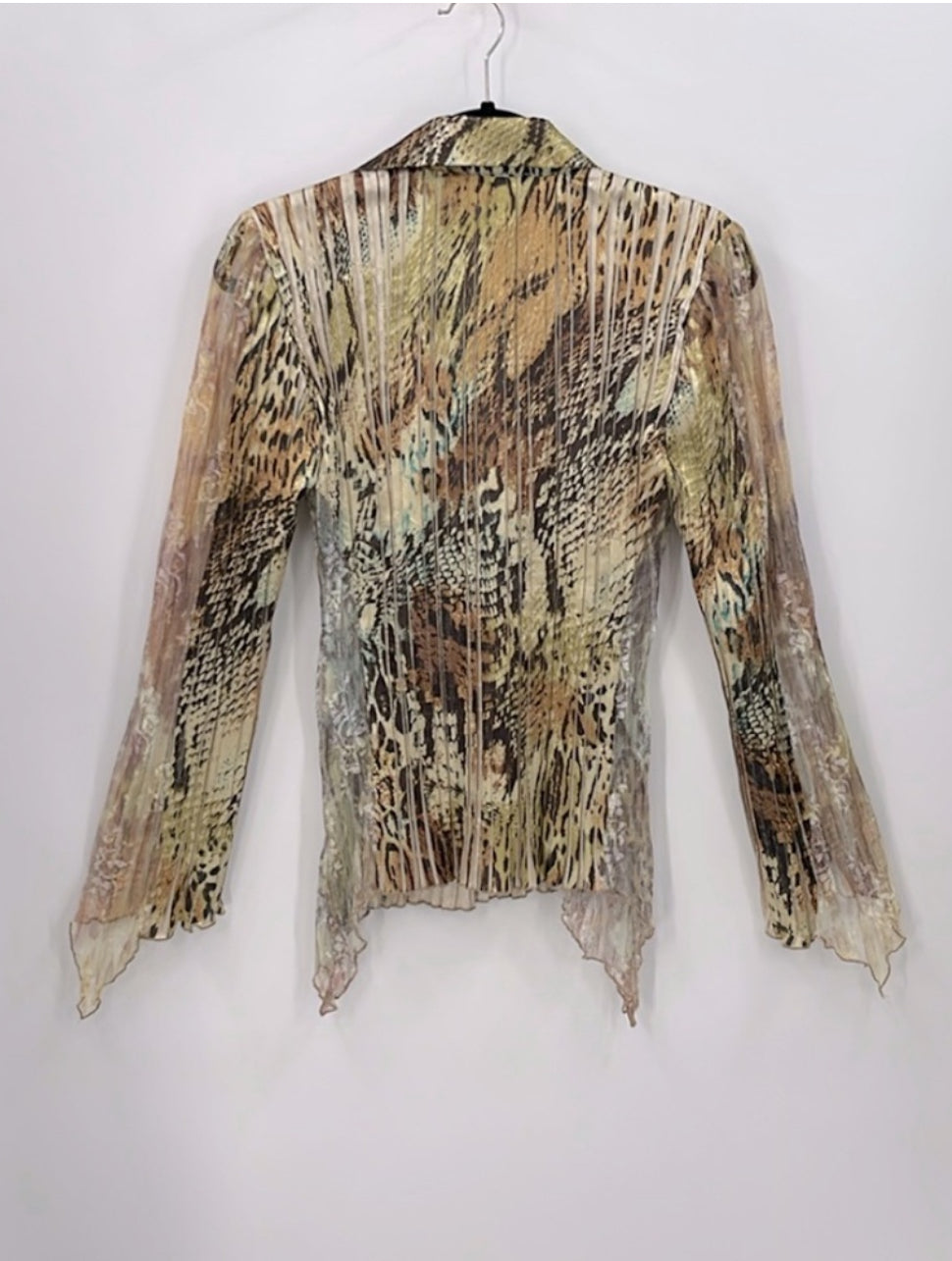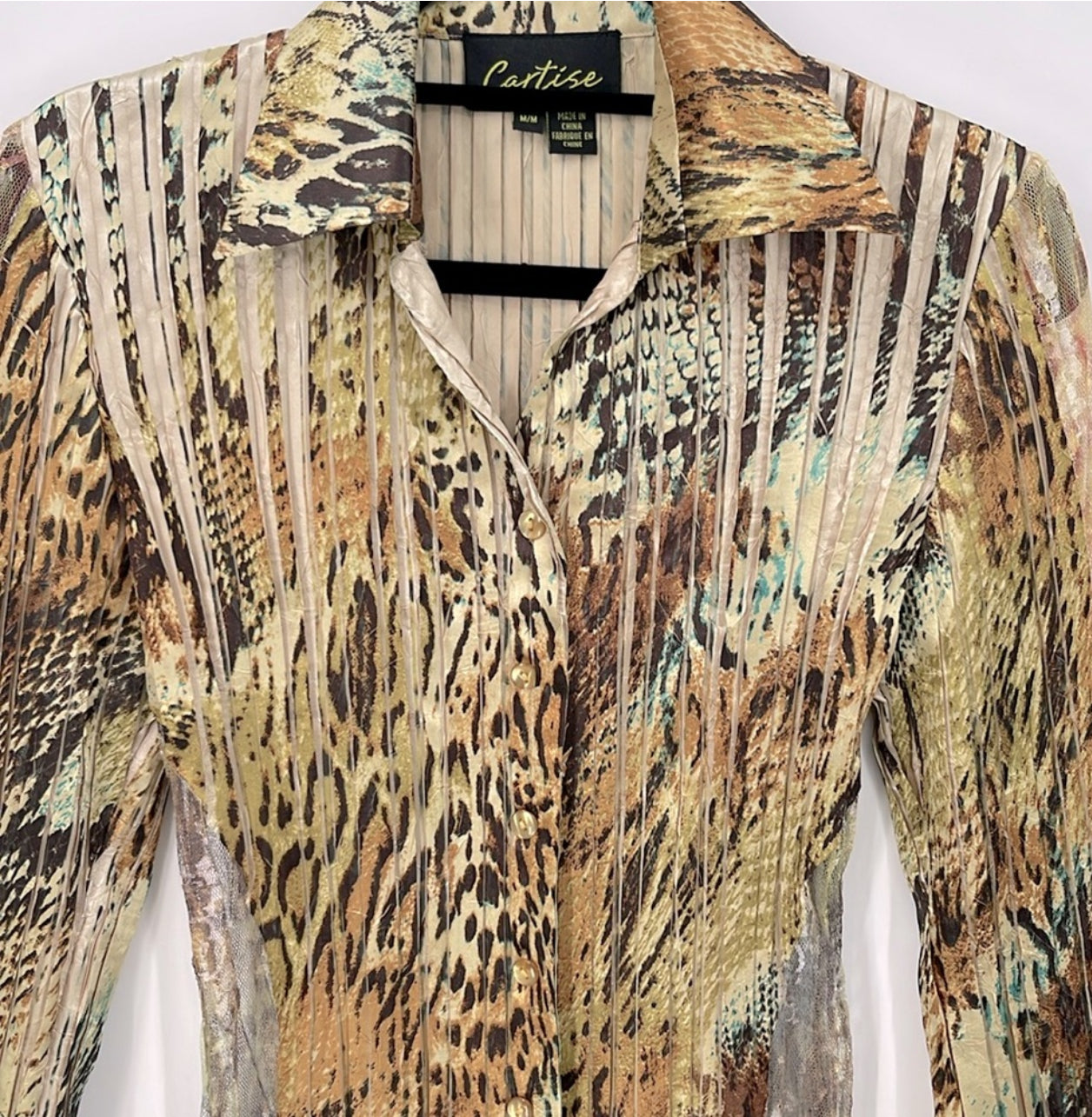 This Animal Print Button Down has an elegant satin finish and inherent style with side and sleeve inserts. Size medium, the approximate measurements are 21 inches pit to pit and 24 inches in length. It is in great pre-owned condition, making it a stylish and sophisticated choice.