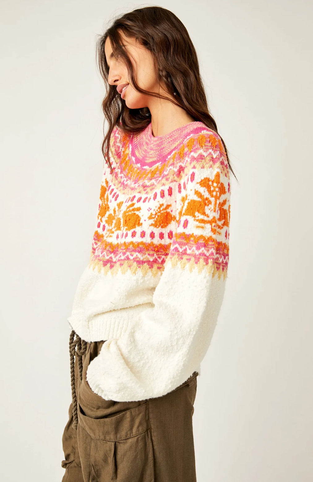 The Free People Nellie Sweater in Whisper White is an all-time classic that you'll want to wear forever. Its scoop neck and ribbed hems provide a comfortable, relaxed fit, while the soft textured fabric gives it timeless style. The vibrant print along the neckline adds a pop of color and extra dimension, making this a must-have for your wardrobe. Made with 13% polyamide, 4% acrylic, and 83% cotton, this sweater is both cozy and durable. Measuring 24" in the chest and 21" in length, it's a versatile and flattering piece for any season.