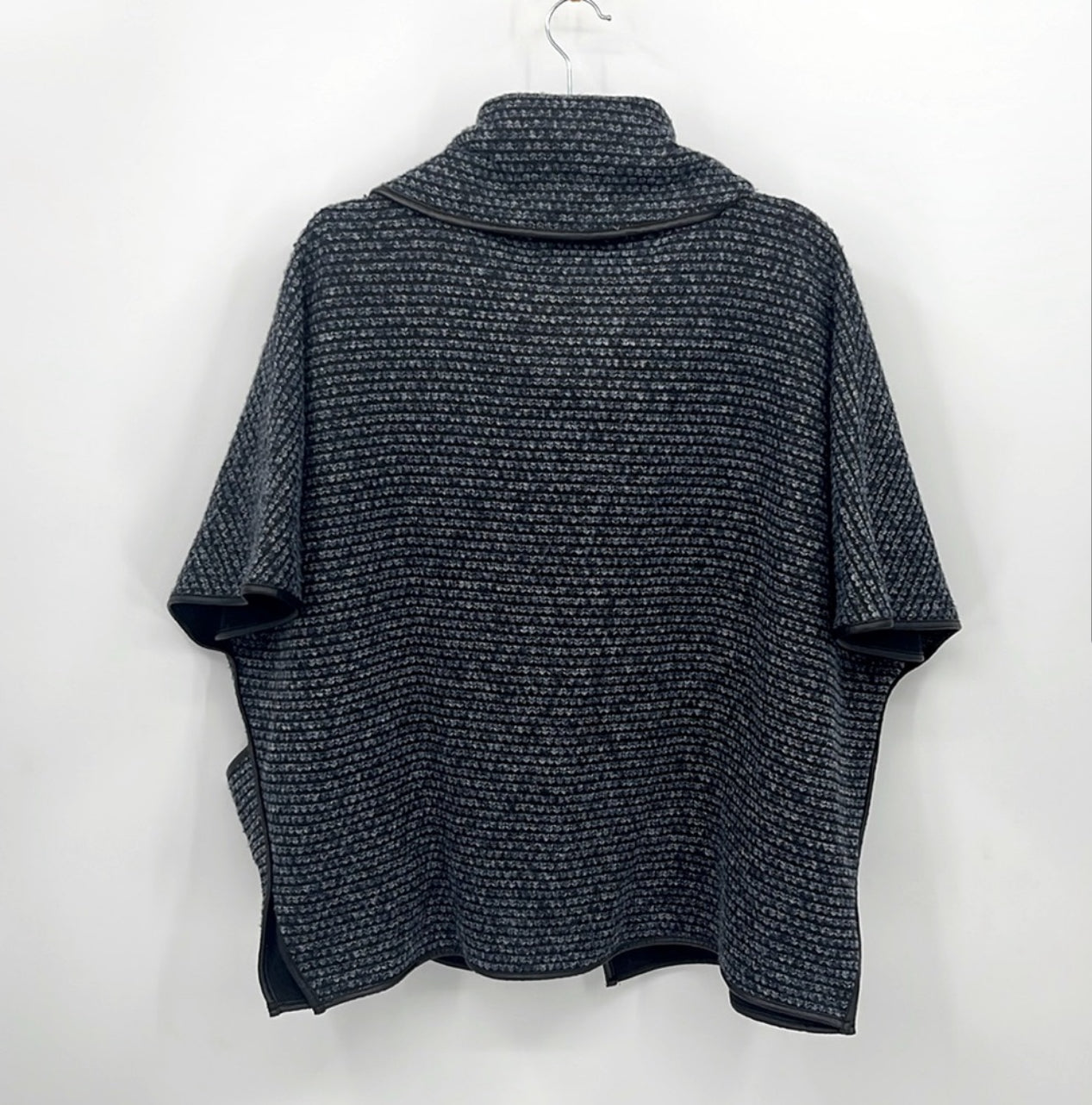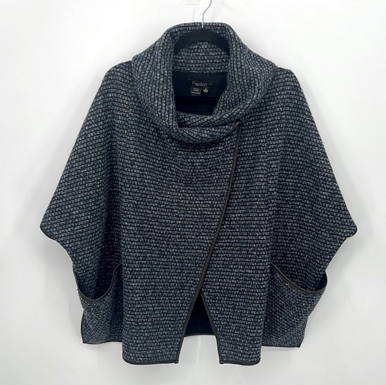 The Papillon Cape features a faux leather trim and is designed with a crossover enclosure, complete with one inside and outside button. It also includes two slip pockets and is made of 100% polyester. This cape is in great pre-owned condition and is available in size small.