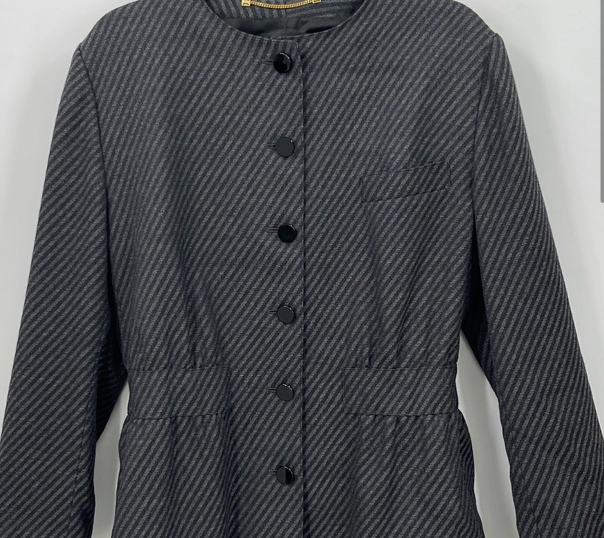 This versatile jacket features a front buttoned closure, an upper pocket, and a cinched waist detail. It also includes a button on the cuff and a stylish striped pattern. Made with 100% wool, it is fully lined and comes in a size 12. The approximate measurements are chest 21and length 28. In excellent pre-owned condition, this jacket is a great addition to any wardrobe.