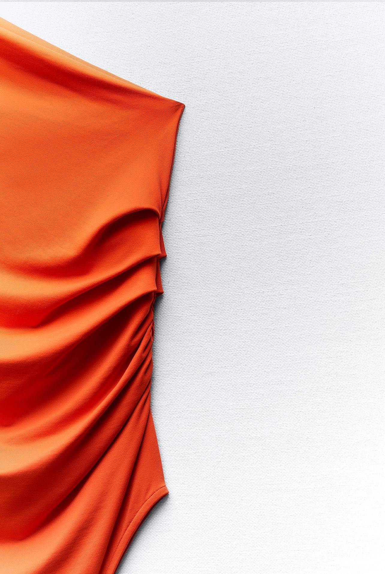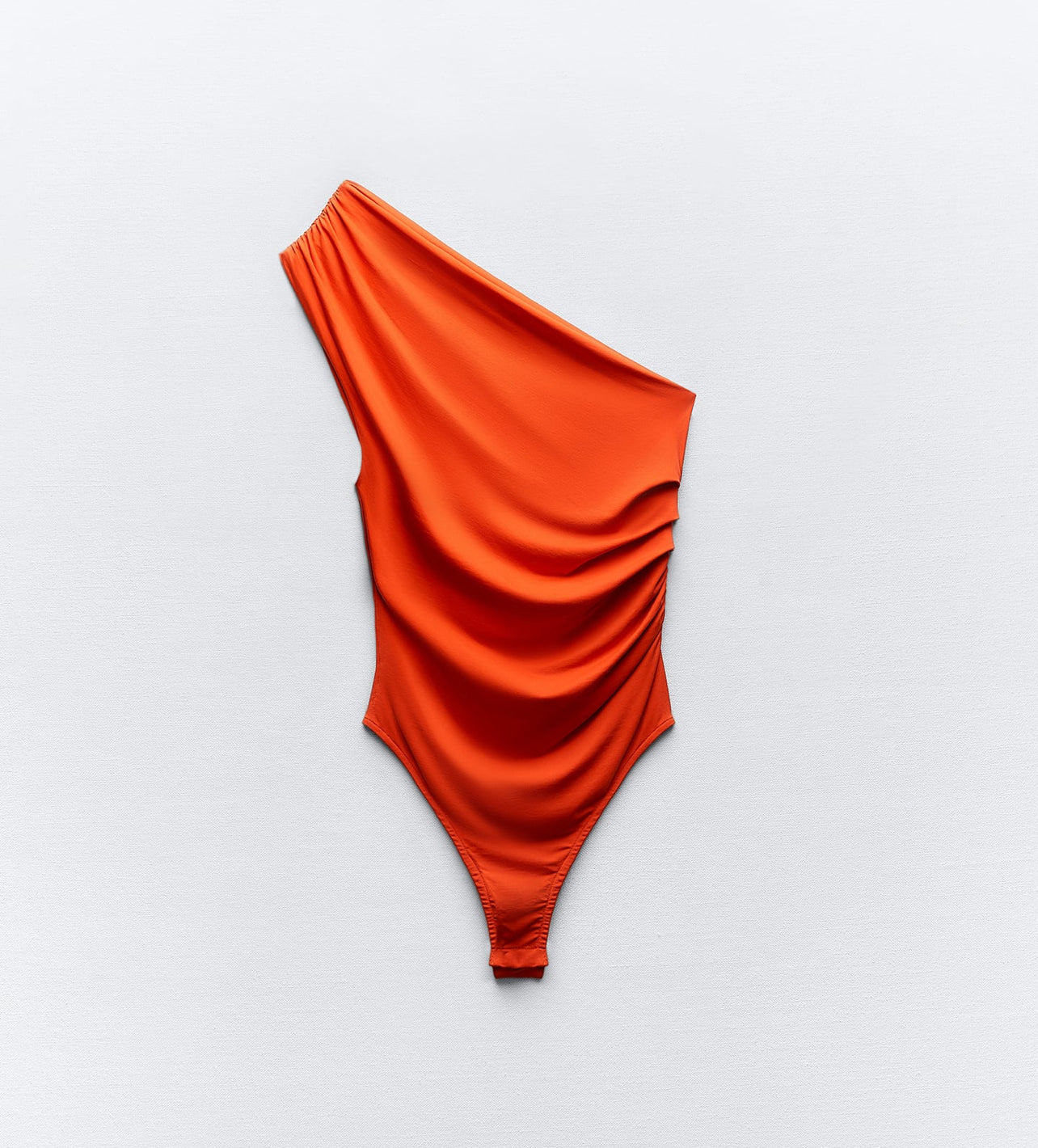 Expertly crafted, this sleeveless bodysuit features an asymmetric design and ruched fabric for a flattering silhouette. The bottom snap button closure ensures a secure fit. Made with 94% polyamide and 6% elastane, with 45% RCS-certified recycled polyamide in the outer shell.