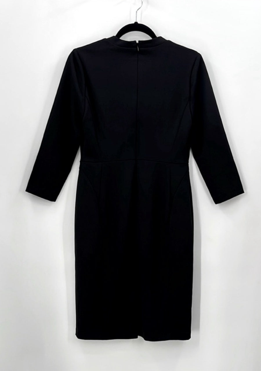 The dress features a V-neck and 3/4 length sleeves, as well as a fully lined design and a back zipper for easy wear. Made from a blend of 95% polyester and 5% elastase, it offers both comfort and style. Available in size 8, the dress has approximate measurements of 18 inches pit to pit and a length of 37.5 inches. It is in excellent pre-owned condition, making it a great addition to your wardrobe.