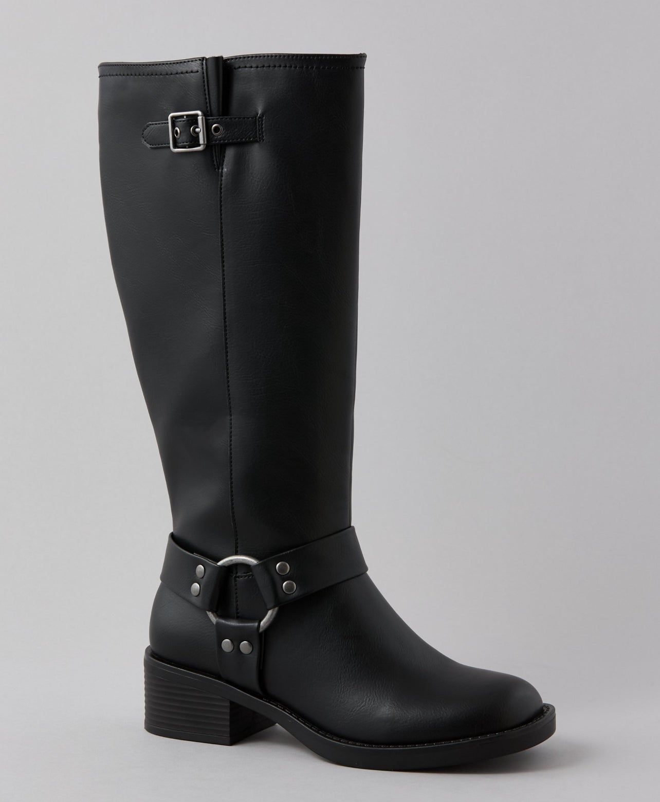 Crafted from smooth vegan leather, this tall pull-on boot features moto-inspired buckles for a tough look.