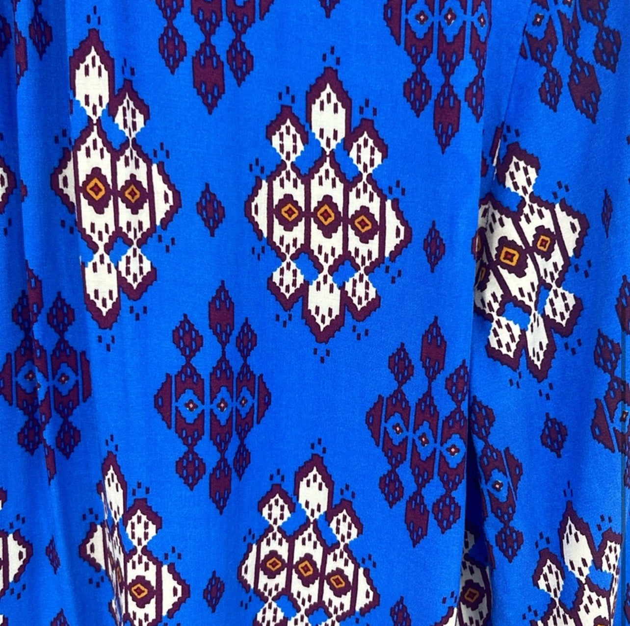 This button down blouse features 3/4 length sleeves and is made of 100% rayon. It comes in a size 10 with approximate measurements of pit to pit 19 inches and a length of 25 inches. The blouse is in great pre-owned condition.