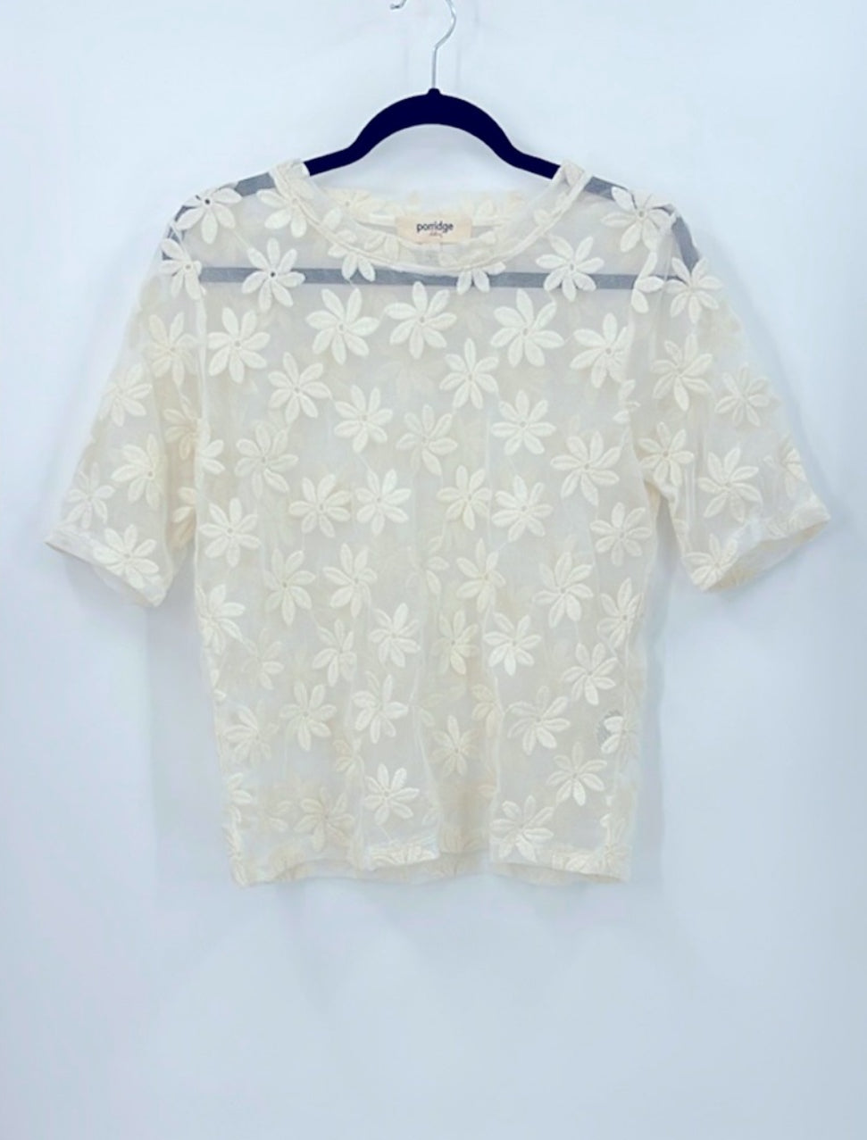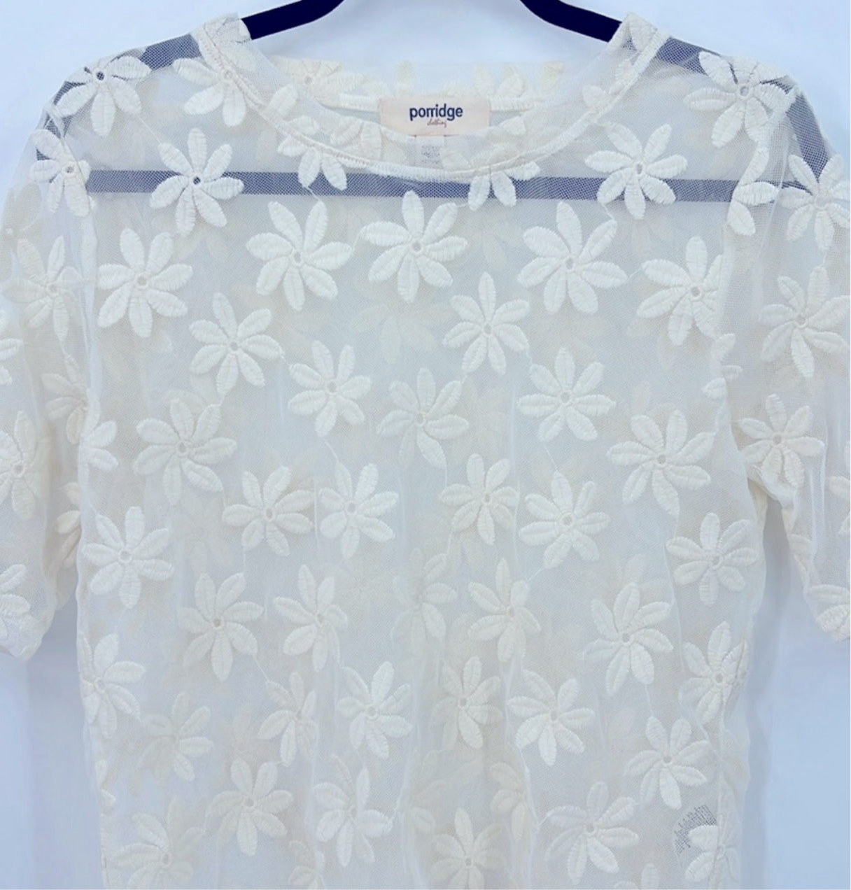 Discover the delicate beauty of the Porridge Daisy Sheer Lace Tee. Crafted from soft nylon, this top effortlessly exudes elegance with its pullover design. To maintain its pristine appearance, we recommend a gentle hand wash. Additional information: Chest measures 20 inches, length measures 22.5 inches. In excellent pre-owned condition.