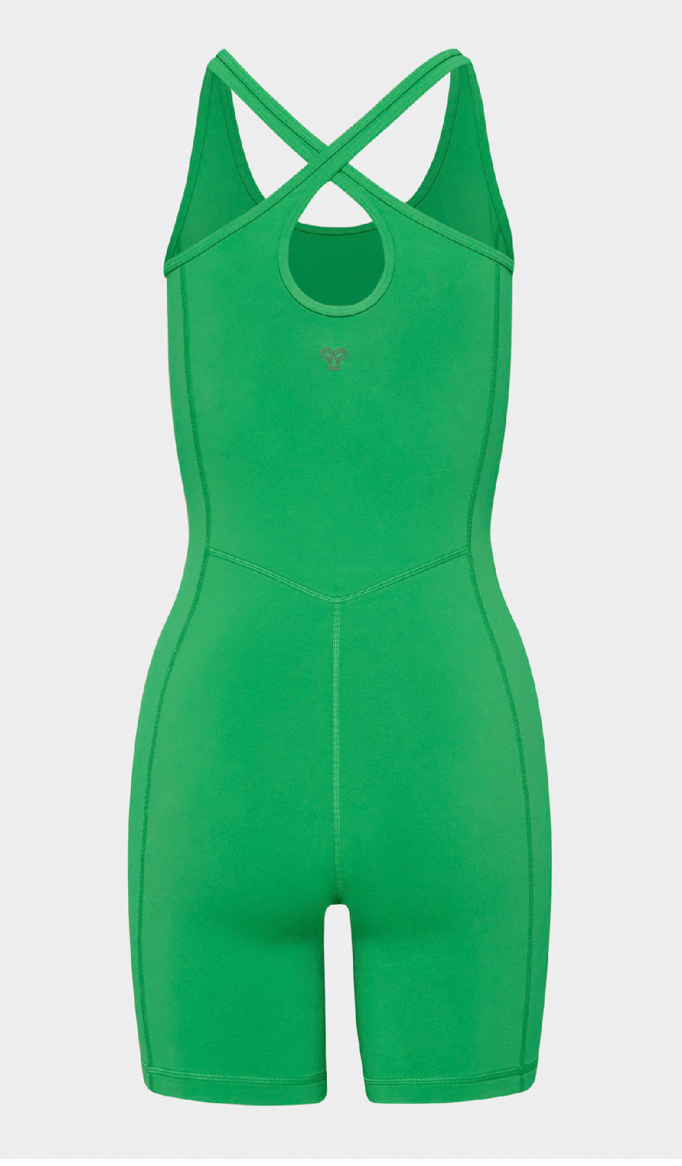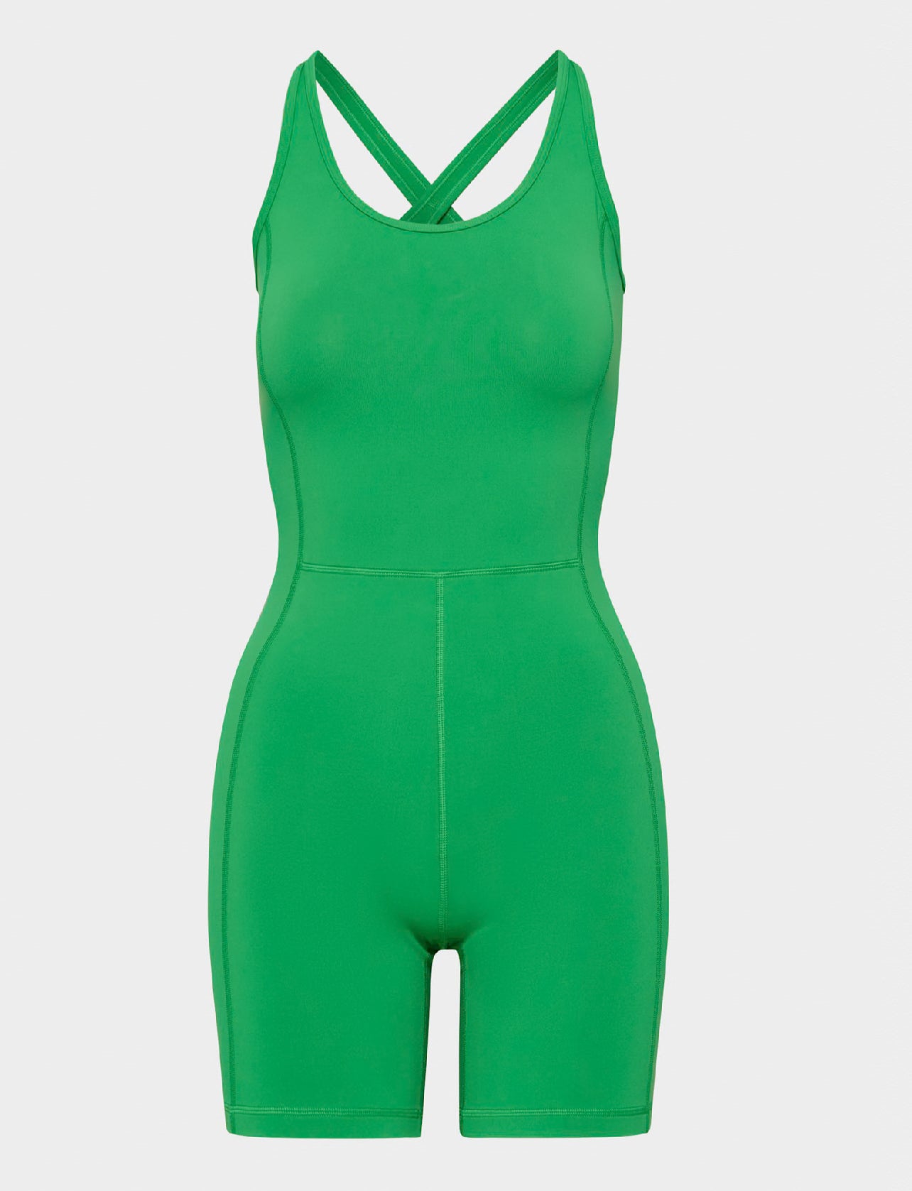 Mentally, at least. This is a scoopneck romper with crossed back straps. It's made with LIFE - a versatile, body-hugging fabric that's sweat wicking and cottony soft.