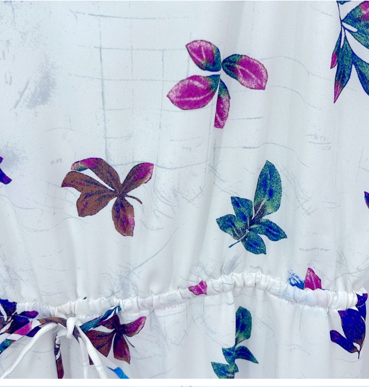 This dress features adjustable straps and a V-neck design, as well as a floral print throughout. The waist can be cinched with a tie, and the back has a crossover detail. Made of 100% poly, this dress is fully lined and comes in a size medium. Approximate measurements include 18.5 inches pit to pit and a length of 38 inches. This dress is in good pre-owned condition.