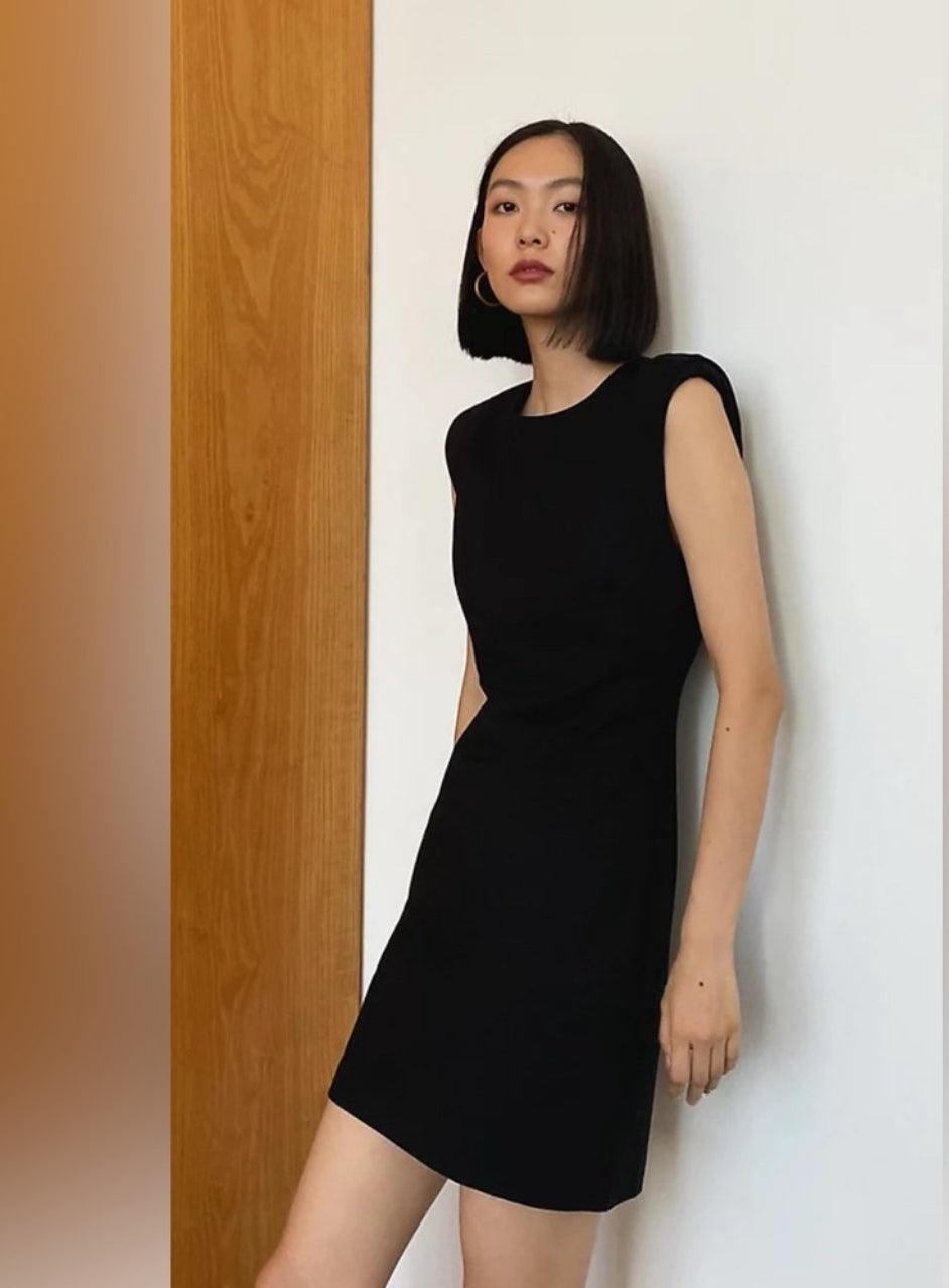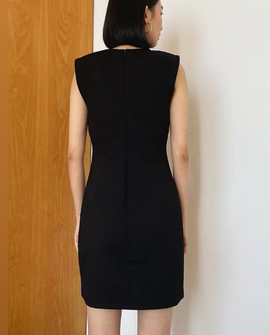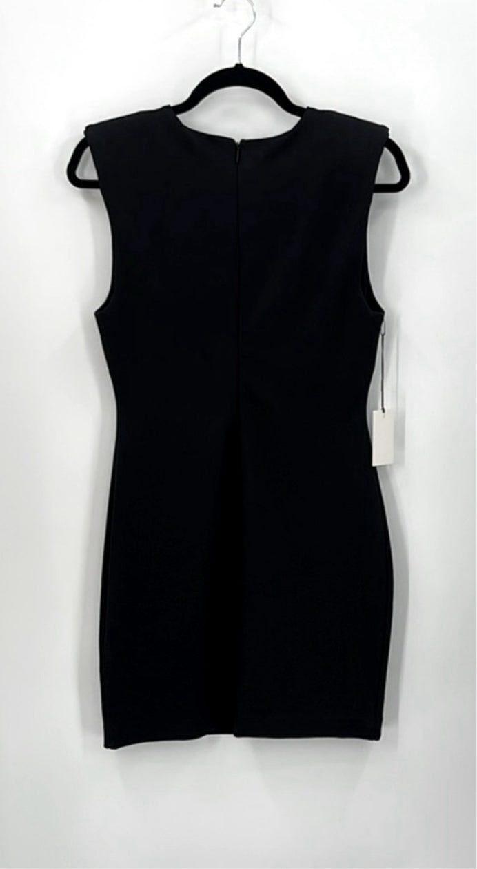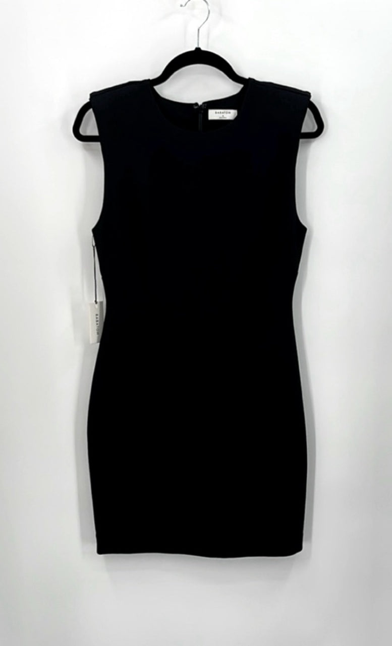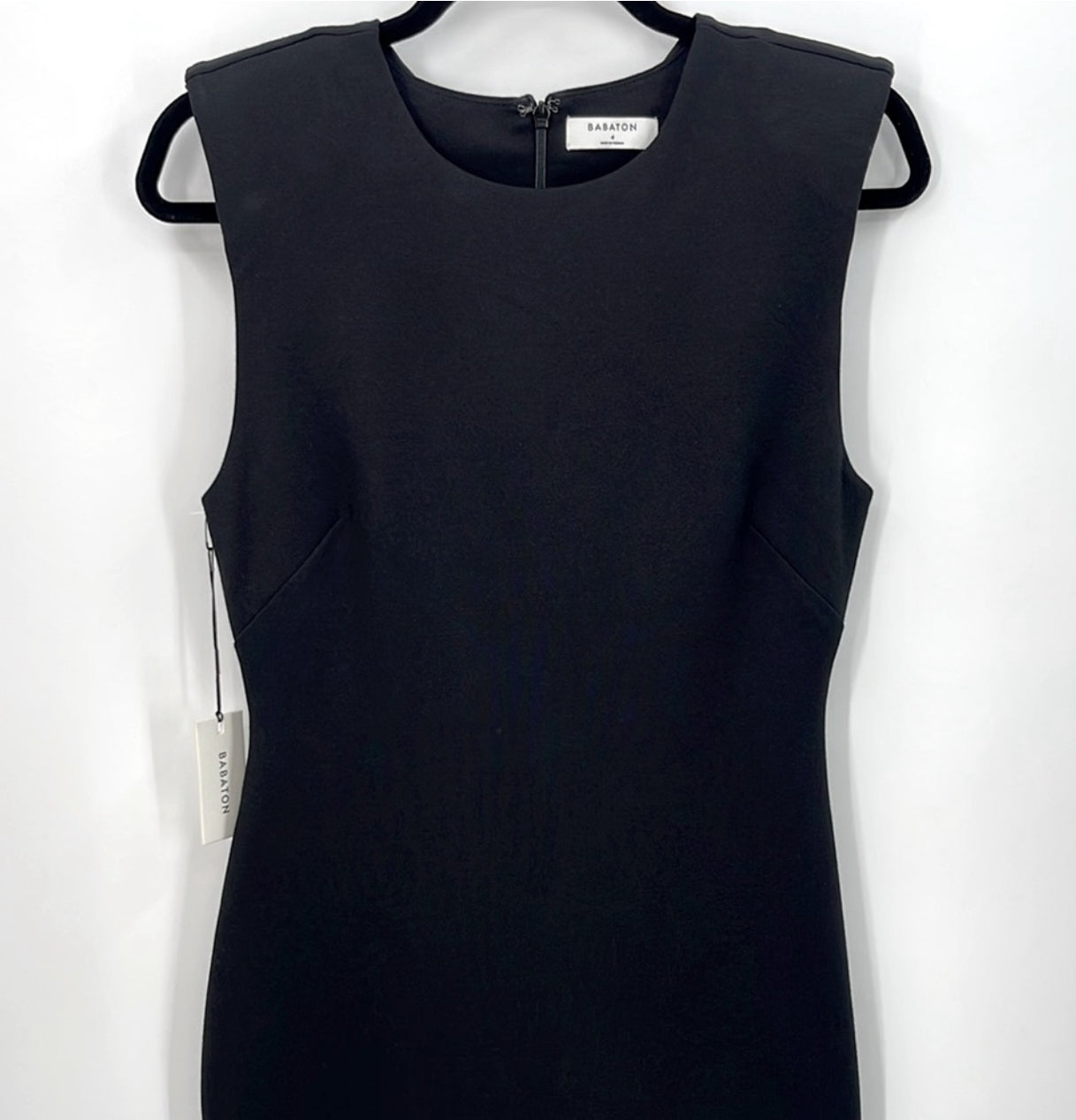 This BABATON Galvin Dress is a form-fitting, sleeveless mini dress with a high neckline and shoulder pads. Constructed with a blend of rayon, nylon, and spandex, it boasts a sleek and stretchy fabric that maintains its shape. The dress is available in size 4 and measures approximately 16 inches across the chest (stretching to 18 inches) and 34 inches in length.