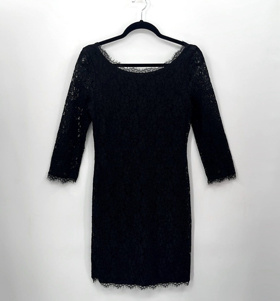 Constructed entirely of delicate lace, this dress features a solid body and sheer 3/4 length sleeves. The back zipper allows for easy wearability. Made with a blend of 80% rayon and 20% nylon, this dress boasts both style and comfort. In size 8, it measures approximately 18 inches from pit to pit and 34.5 inches in length. This dress is in great pre-owned condition, making it a must-have for any wardrobe.