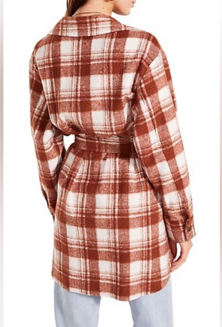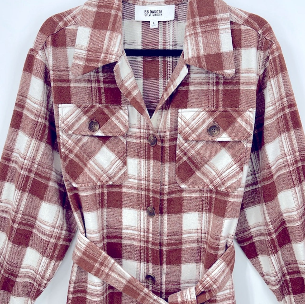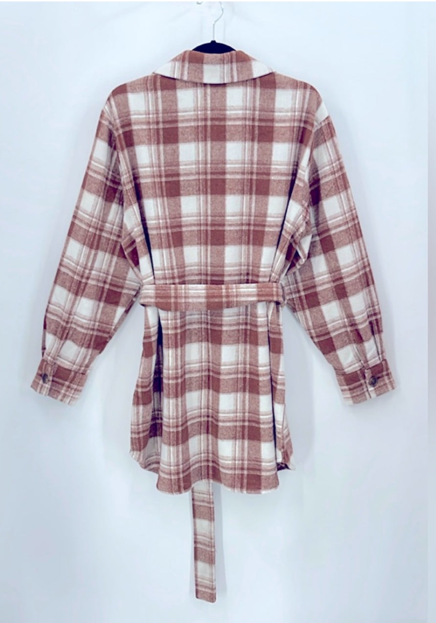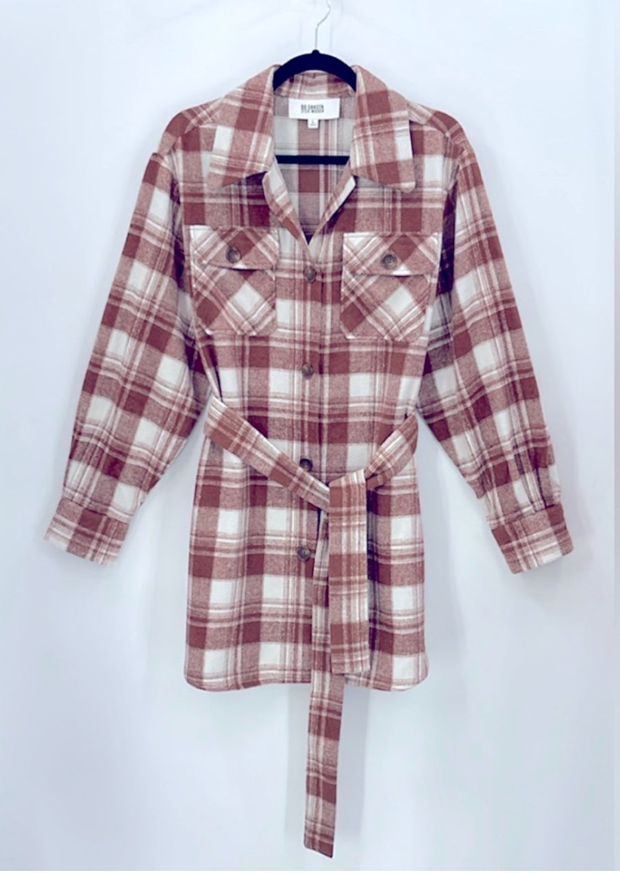 The Maverick shacket is a button-front and belted plaid jacket, complete with patch pockets for a rustic appeal.