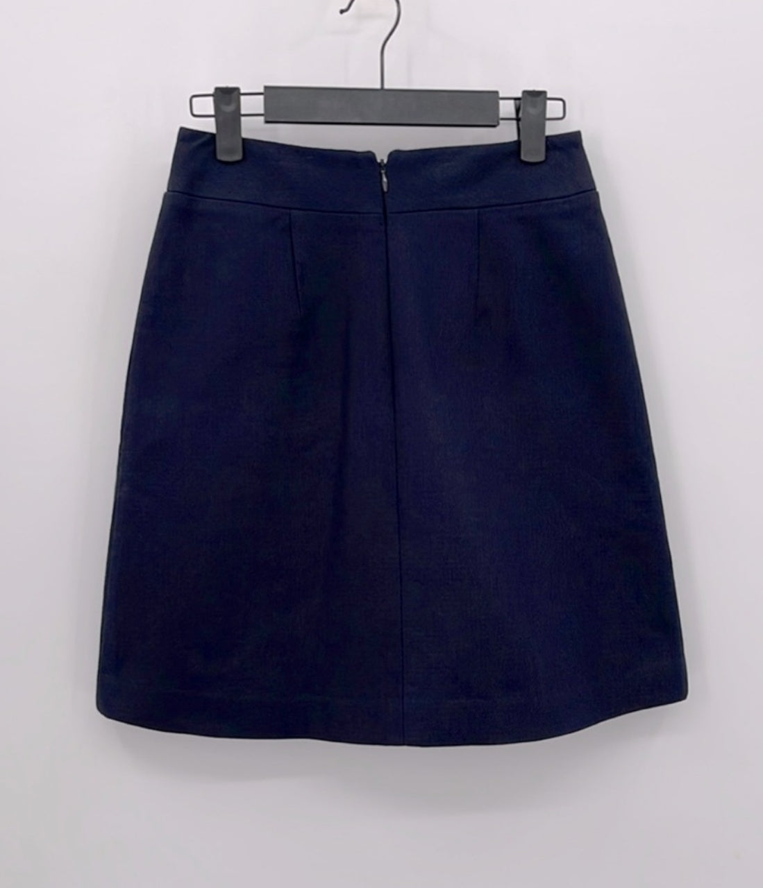 This skirt features a military style design with front button detailing and side pockets. It is fully lined and made with a blend of 97% cotton and 3% spandex. Available in size 0, it has a waist measurement of 13 inches and a length of 13.5 inches. The navy color adds a touch of sophistication. This item is in good pre-owned condition.