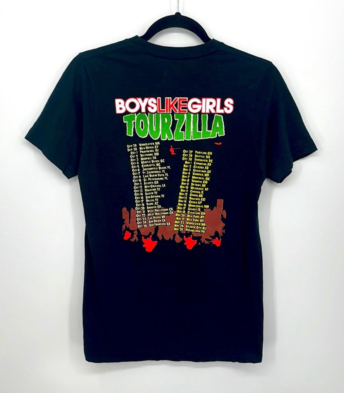 This Boys Like Girls Tourzilla Graphic Tour T-Shirt has a crew neck, short sleeves, and a bold front and back graphic. From the 2007 Tourzilla Tour, the 100% cotton shirt is size small with approximate measurements of 17" pit to pit and 26" length. The item is in good pre-owned condition.
