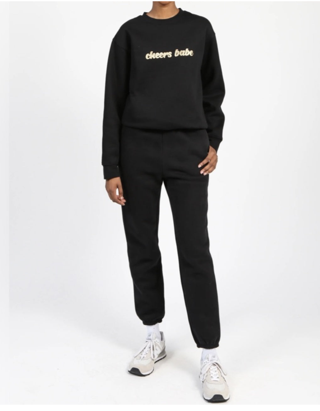 The Cheers Babe Core Crew from Brunette The Label is a limited edition Classic Crew Neck Sweatshirt featuring their iconic holiday saying in gold glitter. With a drop shoulder and slightly relaxed fit, it is recommended to wear true-to-size for a slouchy look or size up for an oversized fit. Made from a signature blend of cotton and polyester, this top guarantees all-day comfort and measures at 21 inches across the chest and 26 inches in length.