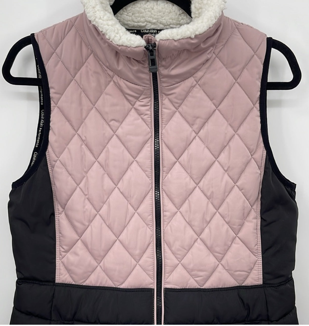 The Calvin Klein Performance Quilted Vest features a front zipper with a Sherpa lined collar, quilted pattern, and front zippered pockets. It also includes an inside zippered security pocket and is made from 100% polyester material. This vest, in mauve/black, is available in a size medium with approximate measurements of 19.5" pit to pit and 26" in length. It is in great pre-owned condition, making it a perfect addition to any wardrobe.