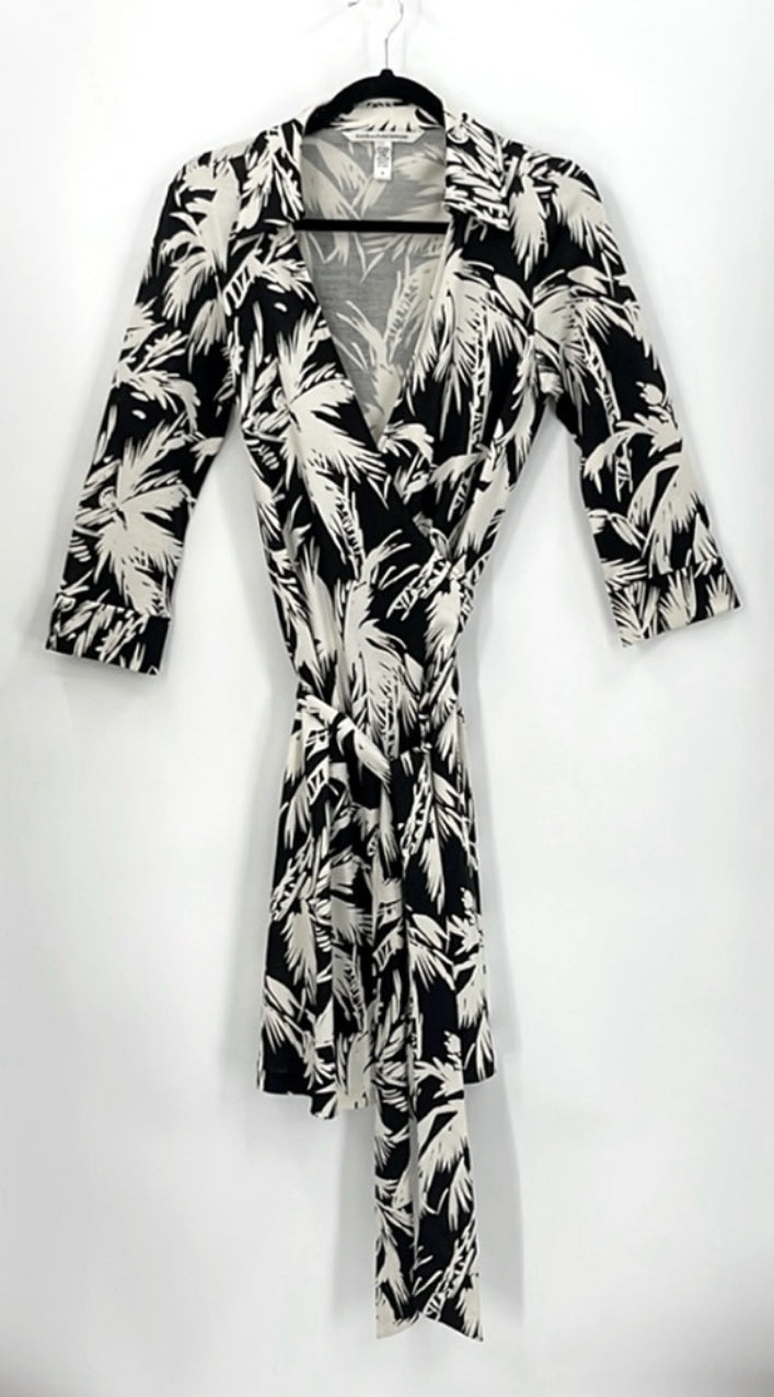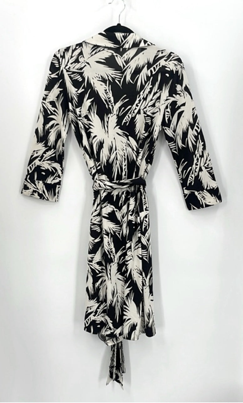 Expertly crafted in 100% silk, this gorgeous Diane Von Furstenberg dress boasts a unique palm pattern and a wrap design with a belt tie for a flattering silhouette. With 3/4 length sleeves and a stretchy fabric, it offers both style and comfort. This size 10 dress is in excellent pre-owned condition and measures approximately 19/20 inches across the chest and 39 inches in length.