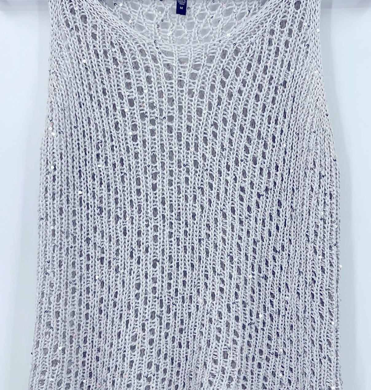 This tank is made of a loosely knit cotton fabric and features shimmering, mirrored sequins. It is composed of 90% cotton and 10% polyester, with a size medium and approximate measurements of 18 inches (stretching to 20 inches) across the chest and a length of 19.5 inches. The tank is in good pre-owned condition.