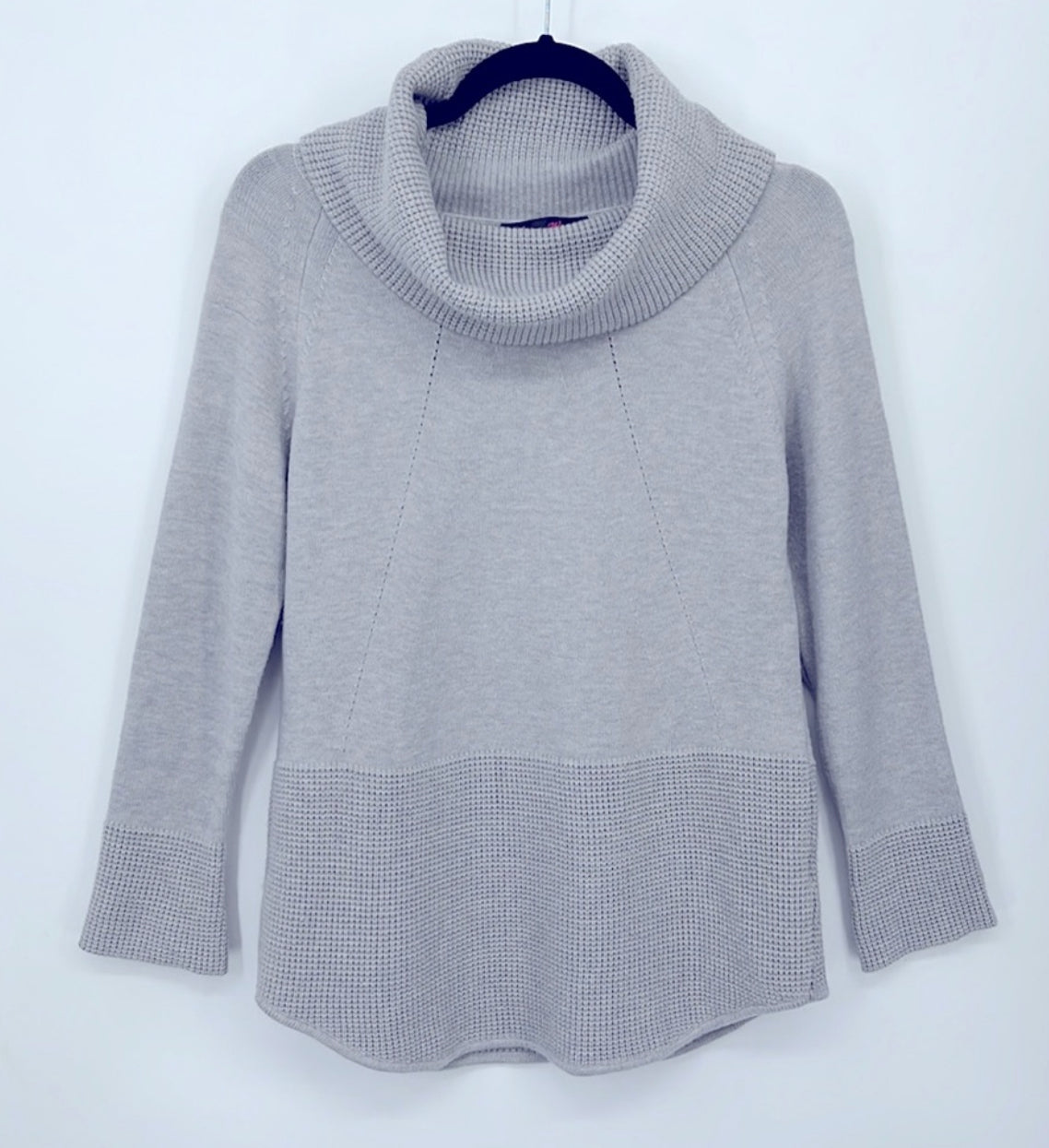This Elena Wang cowlneck sweater features long sleeves with a fabric composition of 30% viscose, 28% polyester, 22% nylon, and 20% modal. The size small measures approximately 18" pit to pit, 25" in length, and is in great pre-owned condition.