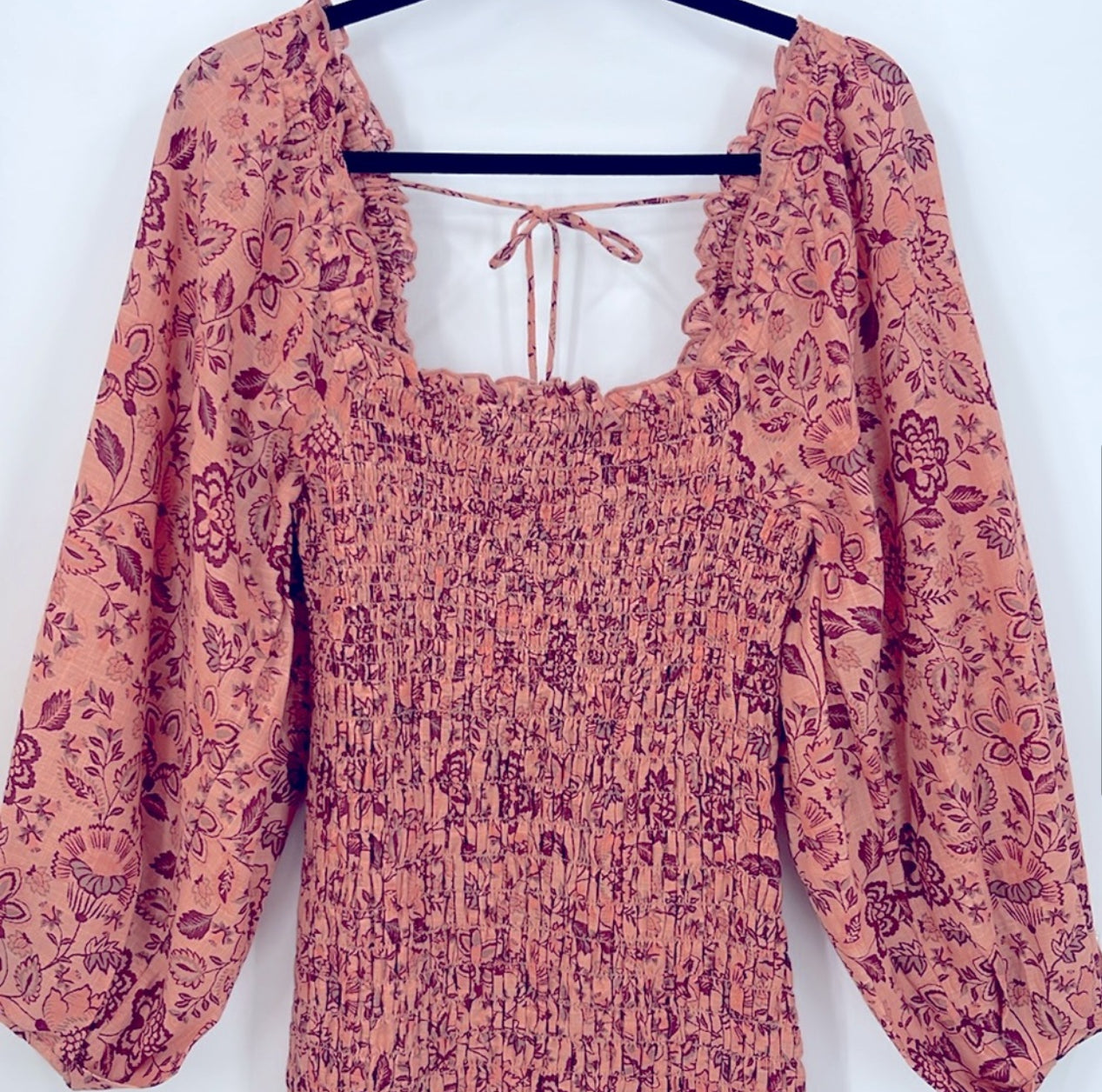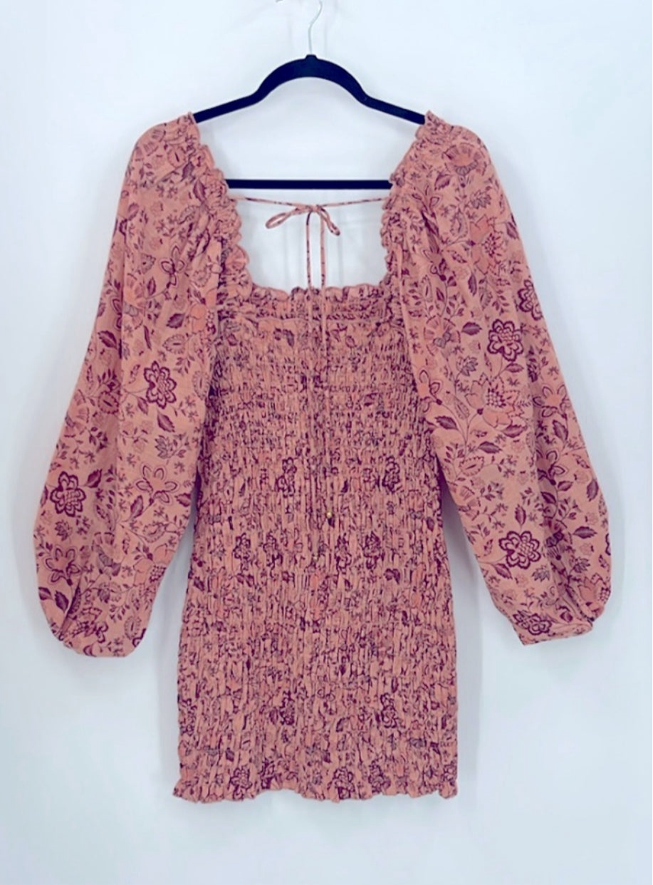 The FREE PEOPLE Smock It To Me Mini Dress features a trendy square neckline, long puff sleeves, and elegant ruffle trim. The dress also includes a back tie closure, and is adorned with a beautiful floral print throughout. Made of 100% cotton, this dress is designed with comfort in mind and is available in size medium. The measurements are approximately 15 inches across the chest , but can stretch up to 19/20 inches due to the smocked back. The dress has a total length of 34 inches and is in excellent pre-owned condition.
