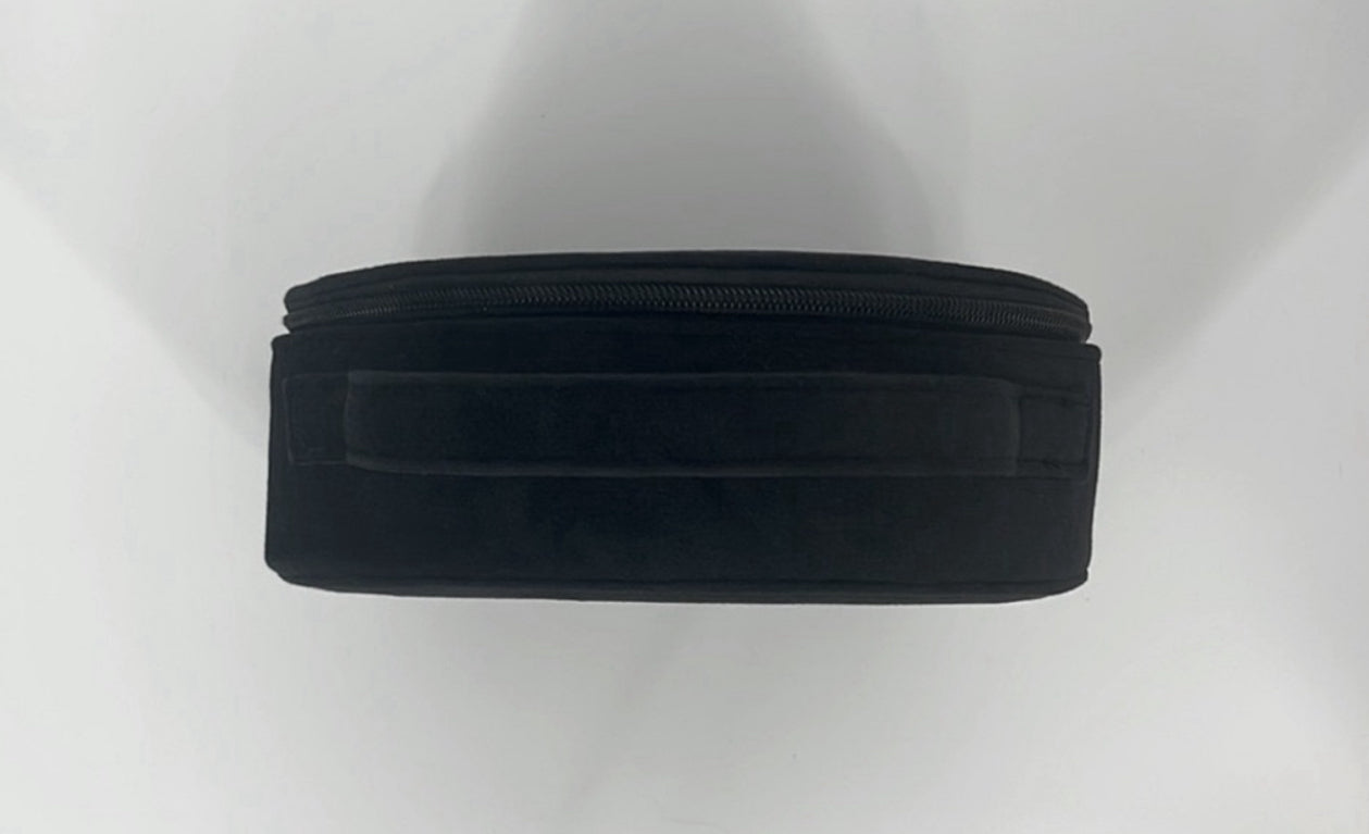 This Giorgio Armani Beauty Velvet Makeup Bag is designed with a round shape featuring a top handle and gold zippered closure. A logo adorns the front, crafted from luxurious velvet material with dimensions of 8" in length, 7" in height, and 2.75" in width. In Good Pre-Owned Condition, there may be some minor scratches on the metal logo from use.