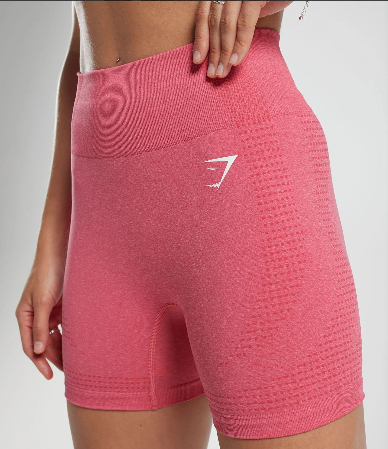 Vital Seamless 2.0 Shorts offer an ideal combination of support, style and technology to help you perform at your best whatever your conditioning goals are. Featuring a ribbed waistband with figure-contouring shading, sweat-wicking tech and breathable marl mesh dots, the high-waisted shorts are made with 93% Nylon and 7% Elastane for a smooth, seamless design. The heat-sealed Gymshark logo offers a signature look, and with an inseam length of 5" based on size M, you'll stay cool and comfortable. To care for them, machine wash cold with the same or similar colours and avoid dry cleaning, ironing, using fabric softeners and bleach.