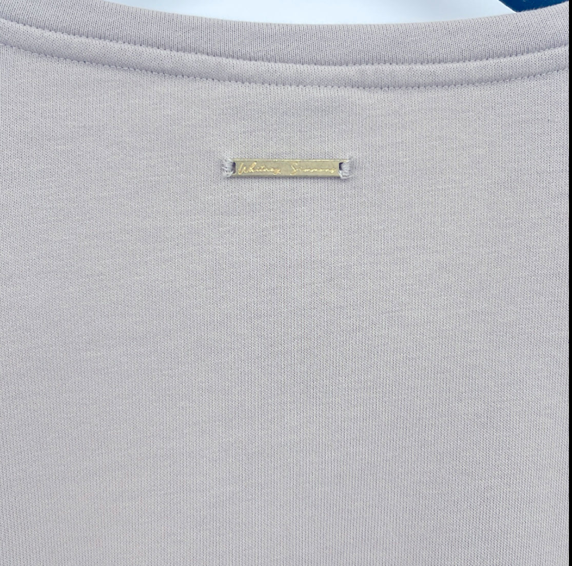 This pullover is a collaboration with fitness expert Whitney Simmons, designed with an elasticized hem for comfort and style. The color is Mink, made from 58% cotton and 42% polyester. Available in size small, approximate measurements include a pit to pit measurement of 20 and a length of 16. This item is in good pre-owned condition.