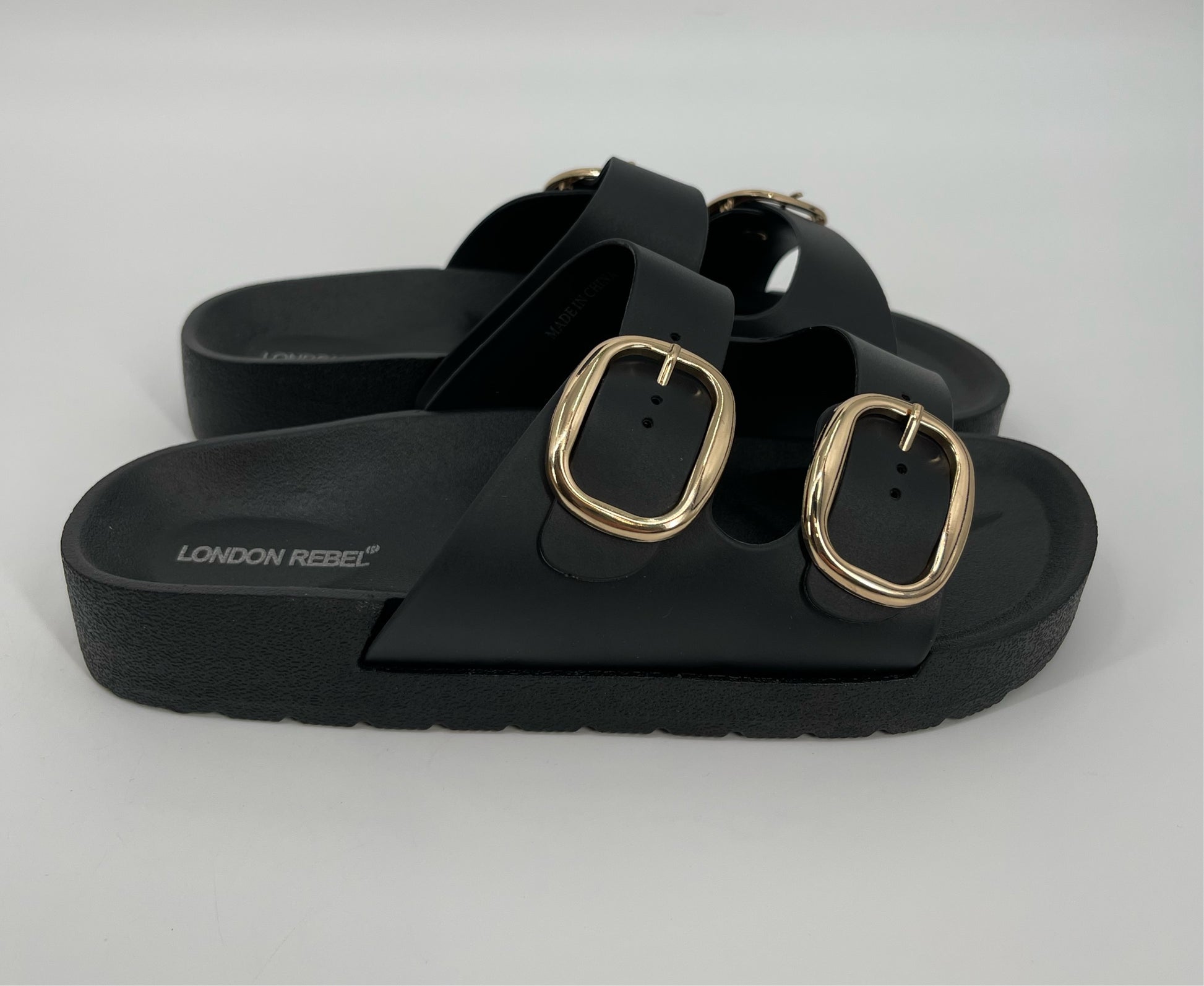 Step up your summer style with the London Rebel Double Buckle Sandals. These trendy sandals feature a smooth faux-leather upper in classic black, with two straps and pin-buckle fastenings for a secure and comfortable fit. The chunky sole adds a touch of edge to your look, making them perfect for pairing with your favorite summer outfits. The sandals are easy to clean with just a damp cloth or sponge, so you can keep them looking great all season long. Get ready to step out in style with the London Rebel Double Buckle Sandals.