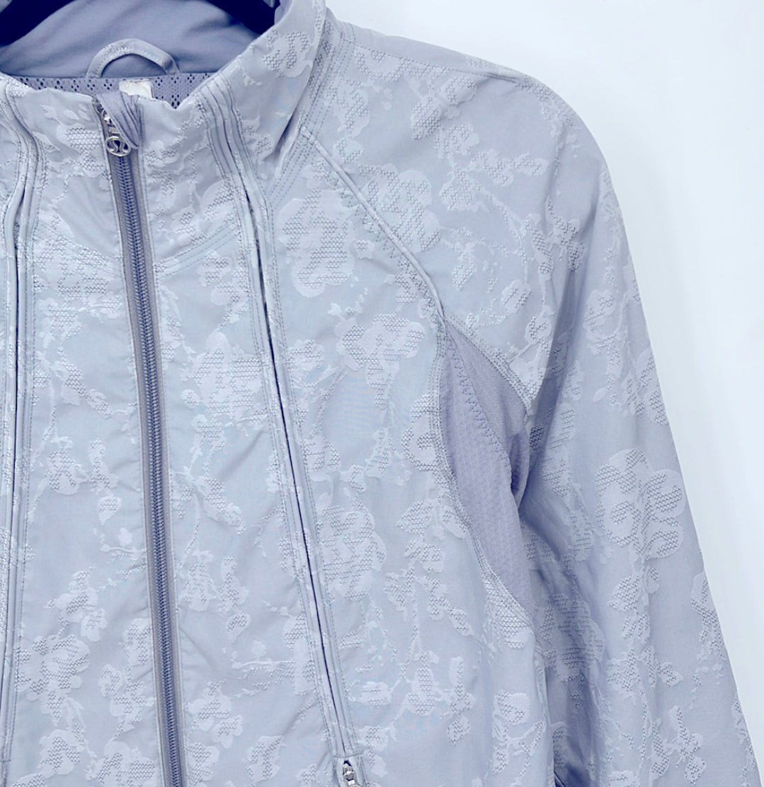 This lightweight jacket from Lululemon provides zippered pockets, adjustable cinch waist, inside media pockets, and ventilation on the upper back for enhanced breathability. Color: Fossil. Size 6. Approximate measurements: Pit to pit 18.5”, length 24”. In Good Pre-Owned Condition with minor wear.