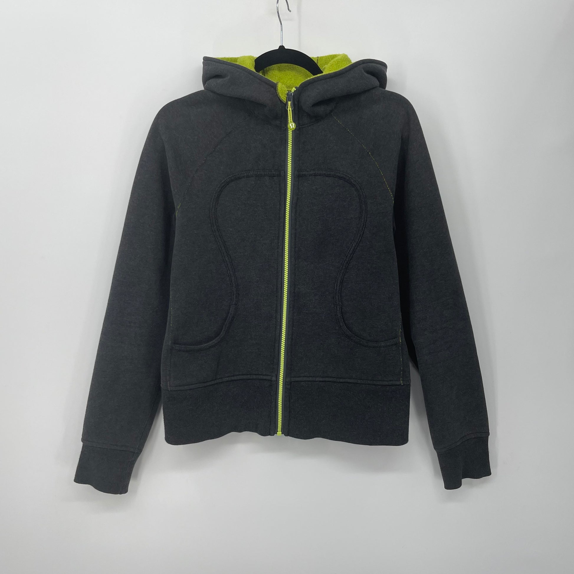 The pre-owned Lululemon Scuba Hoodie, a stylish and comfortable addition to your activewear collection. This hoodie is crafted in a timeless grey colour with vibrant green trim, adding a pop of colour to your look.
