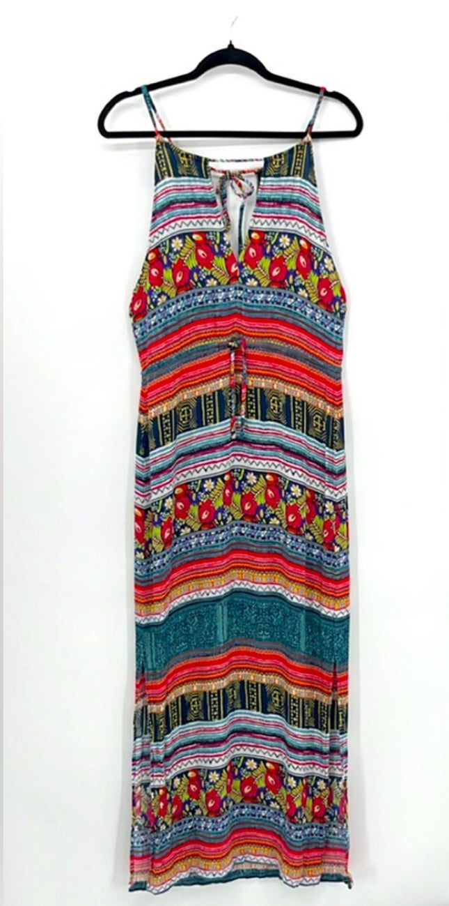 Enhance your style with the MINKPINK Folk Frenzy Dress! This graceful look includes a high neckline with a cut out, adjustable waist tie, and stylish back tie with a daring cut out. The dress also features slits at the hem and is made of 100% luxuriously soft viscose. Approximate measurements are Pit to Pit 18, and the Length is 56 from top of strap to hem. Feel beautiful in this one-of-a-kind dress!