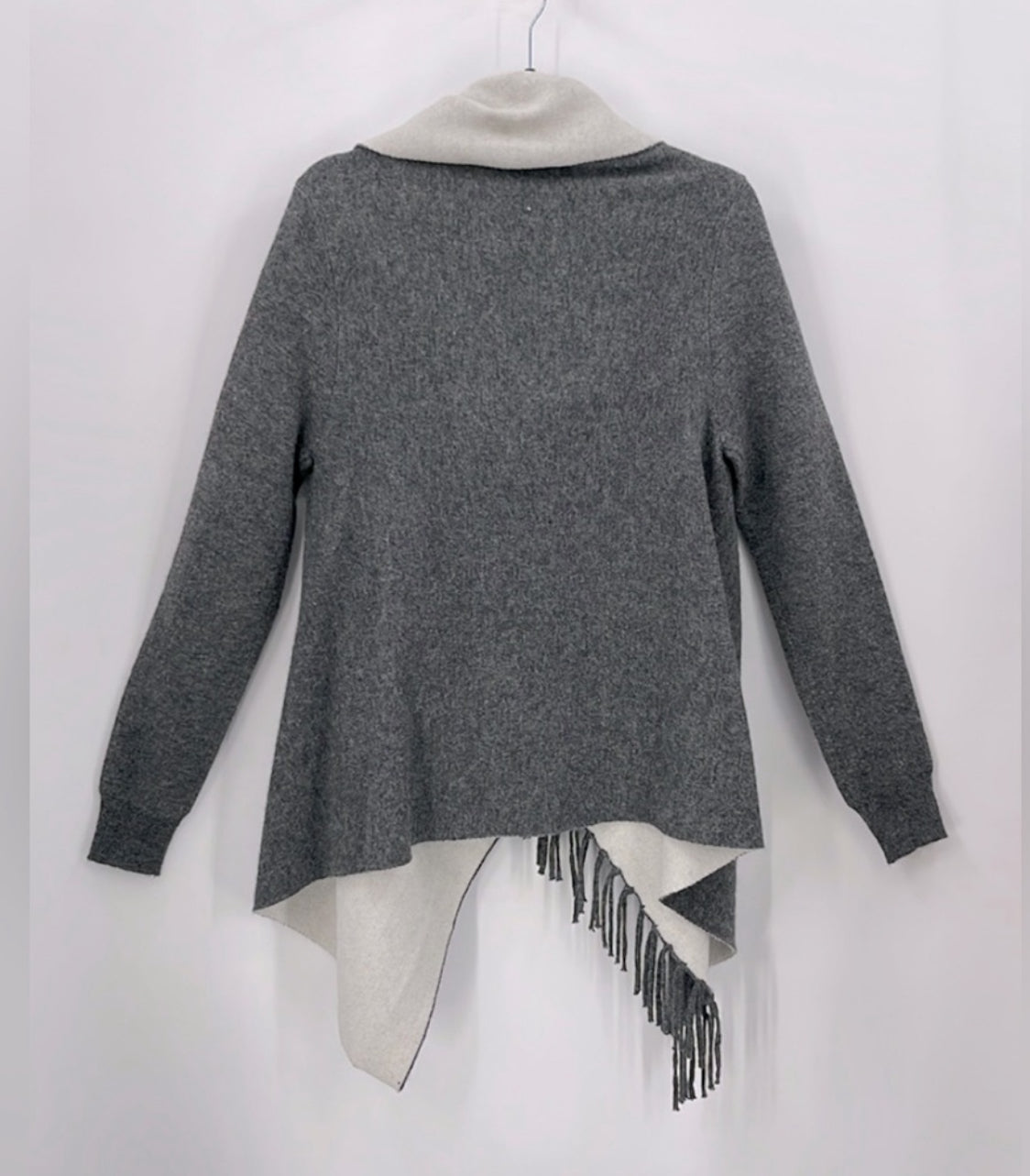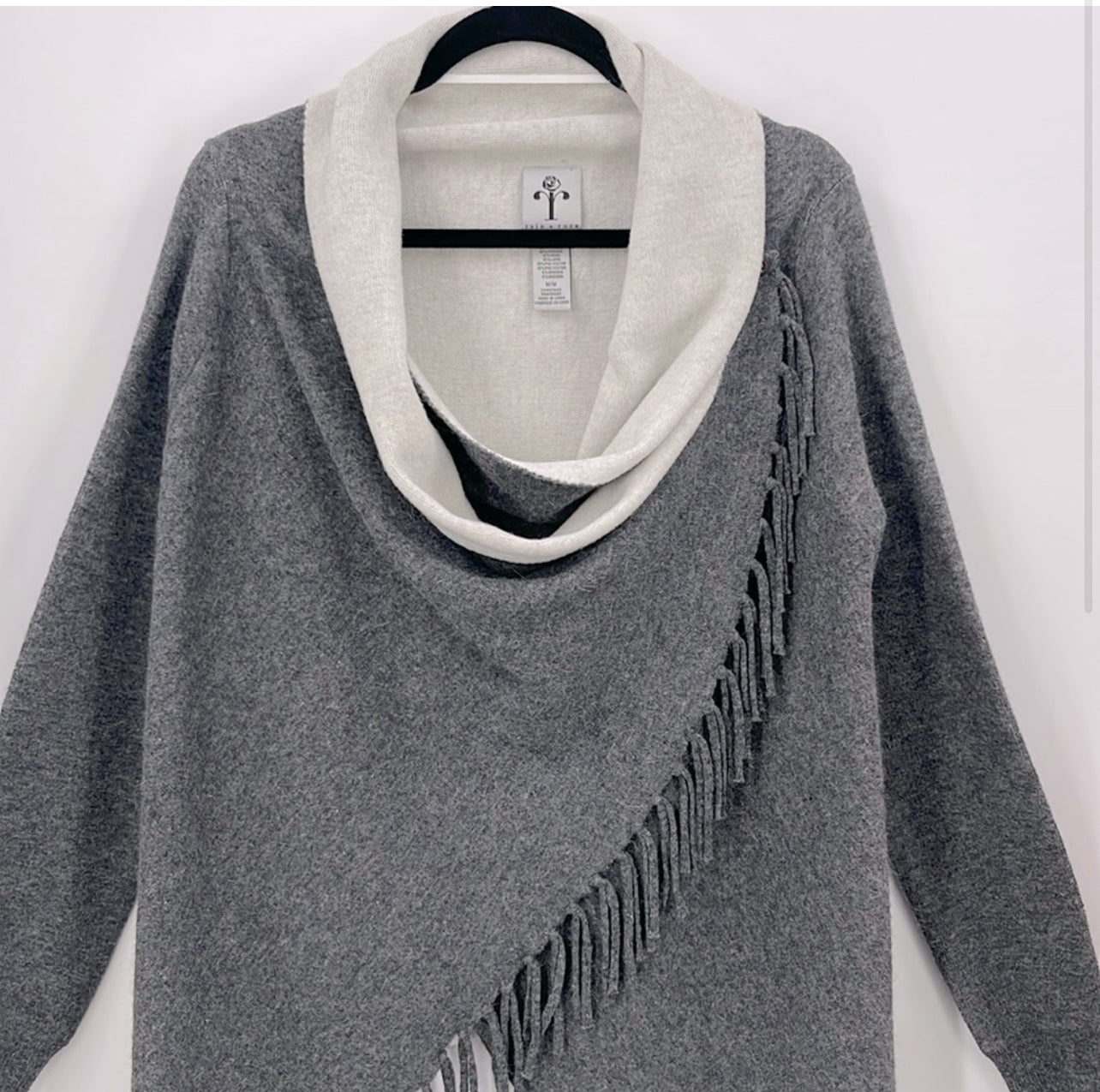 Featuring a grey and ivory color scheme and a fringe detail, this Rain + Rose Wool Blend Wrap Cardigan is designed with a stylish over front and two buttons at the top. The cardigan is a size medium and made with 40% polyamide, 30% viscose, 15% wool, 10% polyester, and 5% angora. Its approximate measurements include a pit to pit measurement of 17.5 inches, a front length of 35 inches, and a back length of 26 inches.