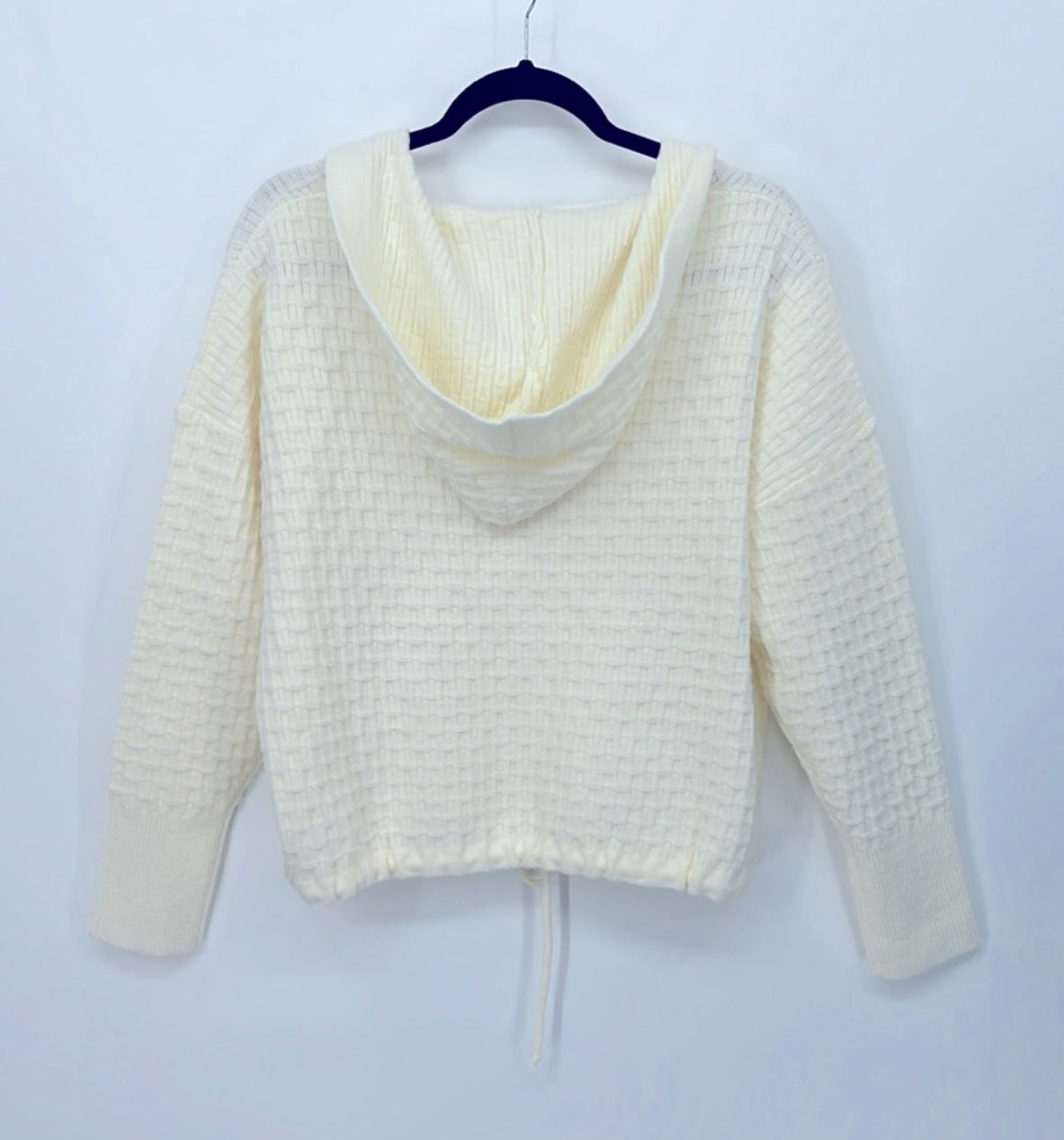 The product features a button-down design, V-neckline, and hem with an adjustable tie for a comfortable and customizable fit. With an oversized fit, this sweater hoodie is made of 52% acrylic, 28% nylon, and 20% polyester, ensuring both warmth and durability. Available in size small, approximate measurements include a pit-to-pit width of 23 inches and a length of 21 inches.
