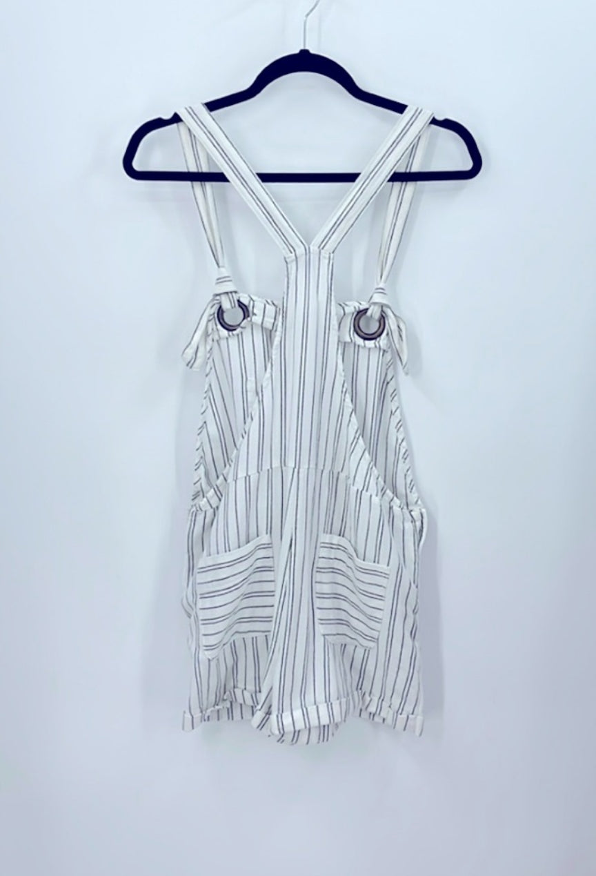 Stylish shortalls featuring a striped pattern, adjustable straps, and a front pocket. Constructed with 100% cotton for comfort and durability. Includes side and back pockets for added functionality. Size medium with approximate measurements of waist at 18 and length at 31. In good pre-owned condition.