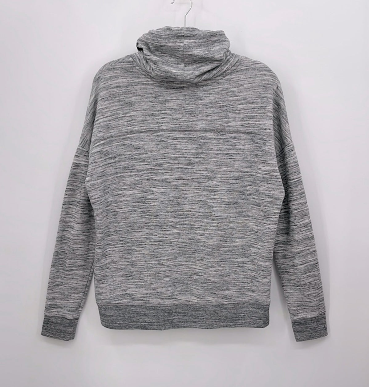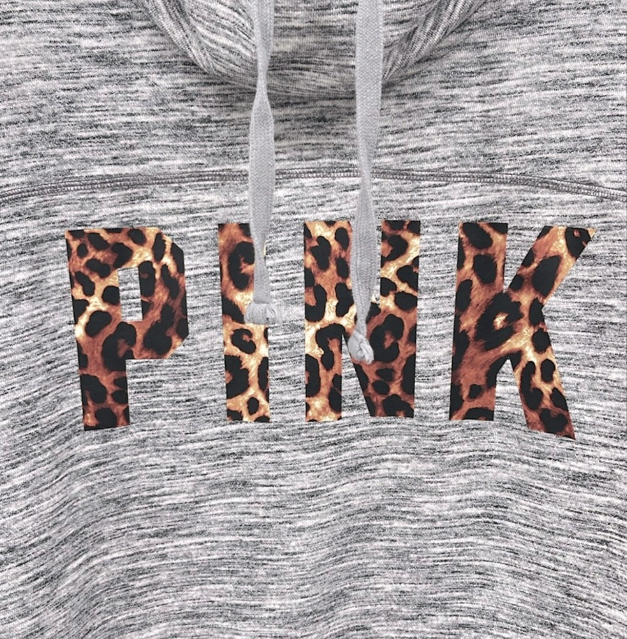 This sweatshirt features a funnel neck with a drawstring and a logo on the collar. The front logo is in an eye-catching animal print, and the material is a blend of marled grey cotton and polyester. The medium size has approximate measurements, with a 24-inch pit to pit and a 26-inch length. This sweatshirt is in good pre-owned condition.