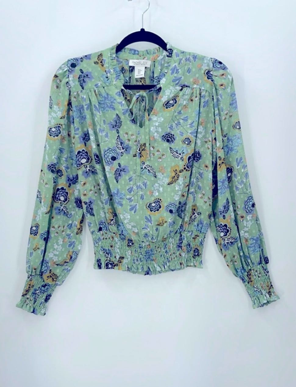 This V-neck peasant blouse is designed by RACHAEL ZOE and features a semi-sheer Swiss dot floral pattern. It also has a high ruffled neckline with a front tie, smocked cuffs and hem, and is made of 100% polyester. Available in size small, its approximate measurements include a 23-inch pit to pit width and a 22-inch length. This item is in great condition as it is pre-owned.