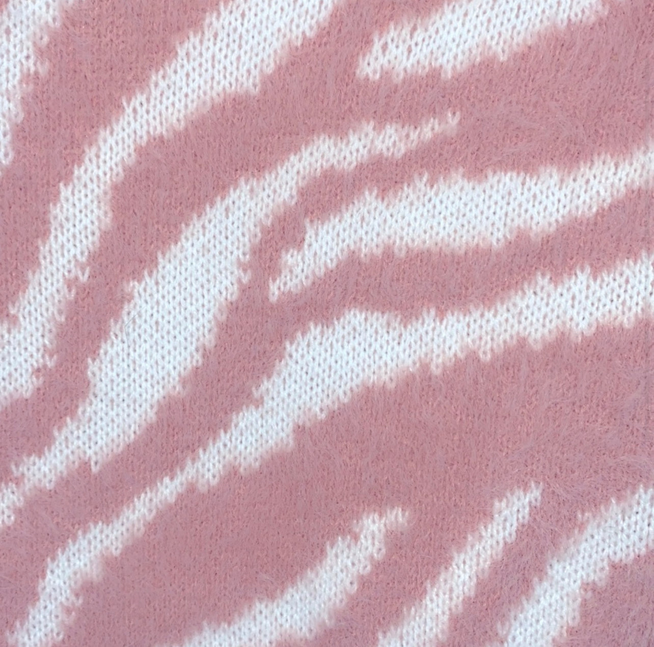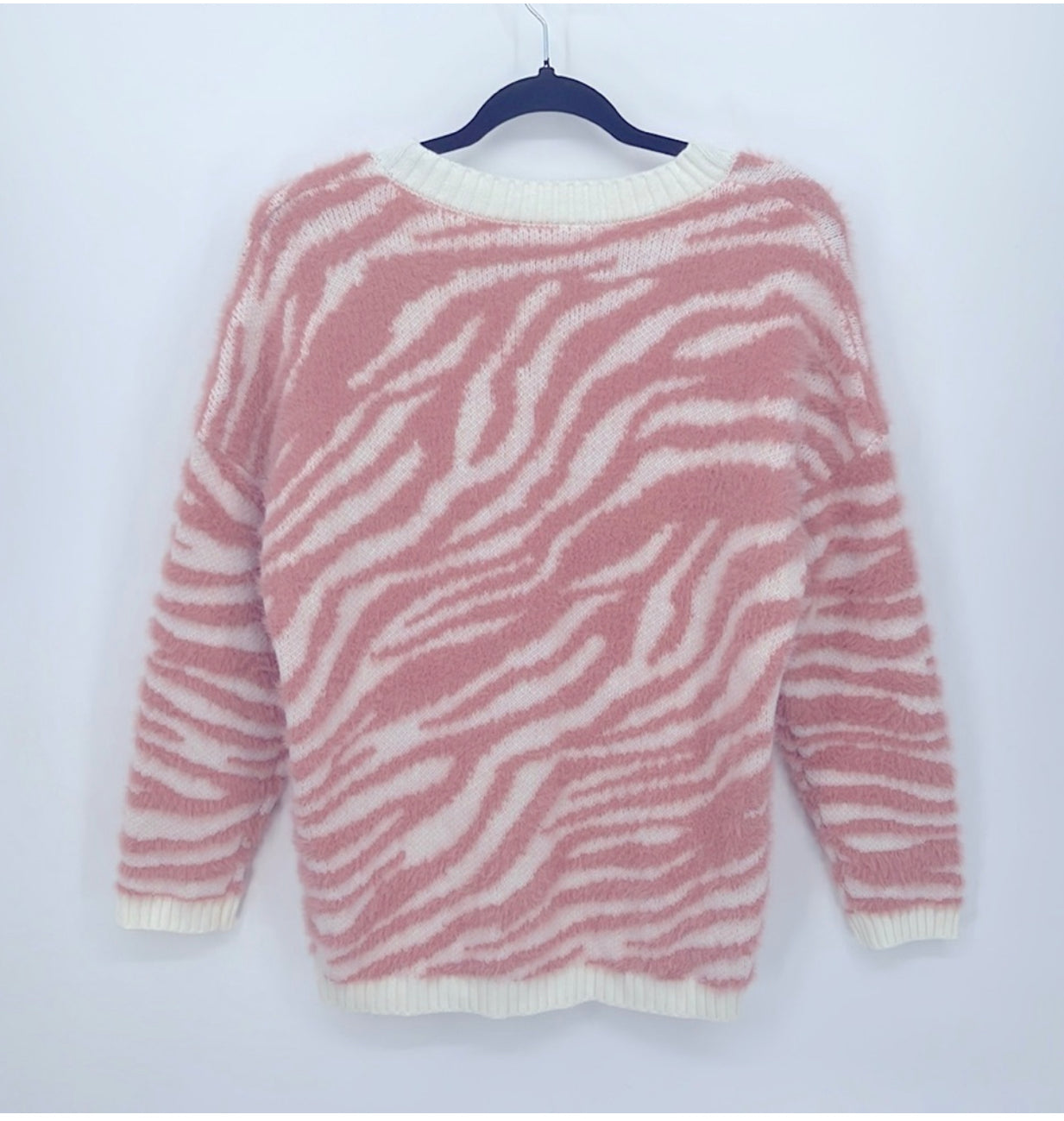 This long sleeve oversized one reason sweater features a v-neck, an animal print, and a loose fit. It is comprised of 50% nylon and 50% acrylic, and size small contains approximate measurements of 21" pit to pit and 24 1/2" length. This garment is in excellent pre-owned condition.