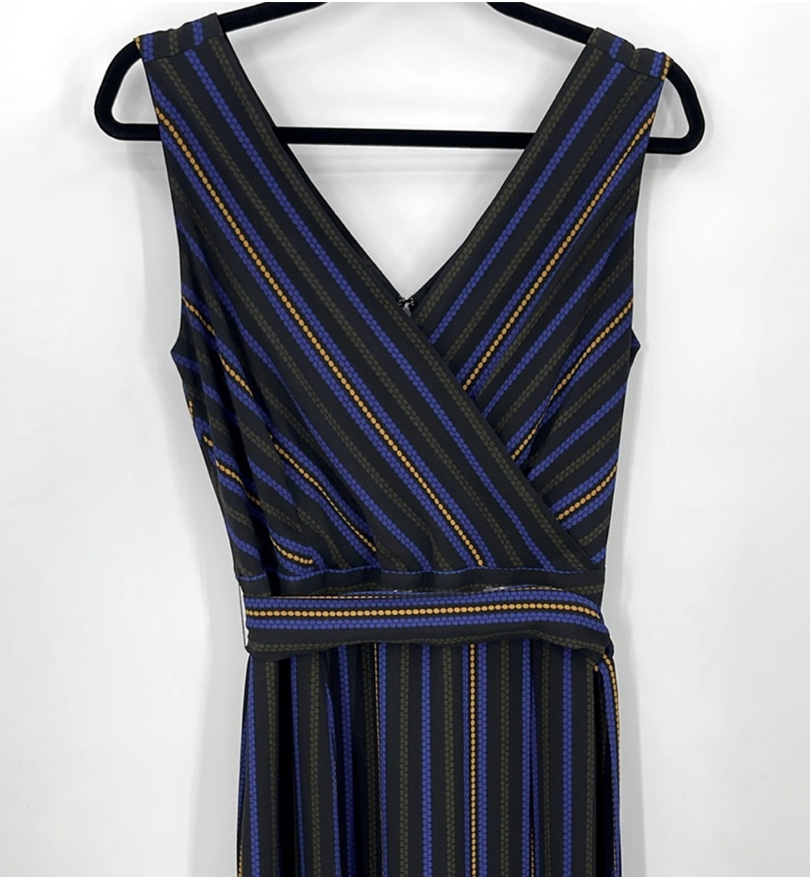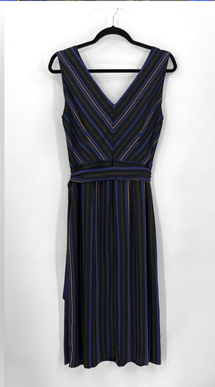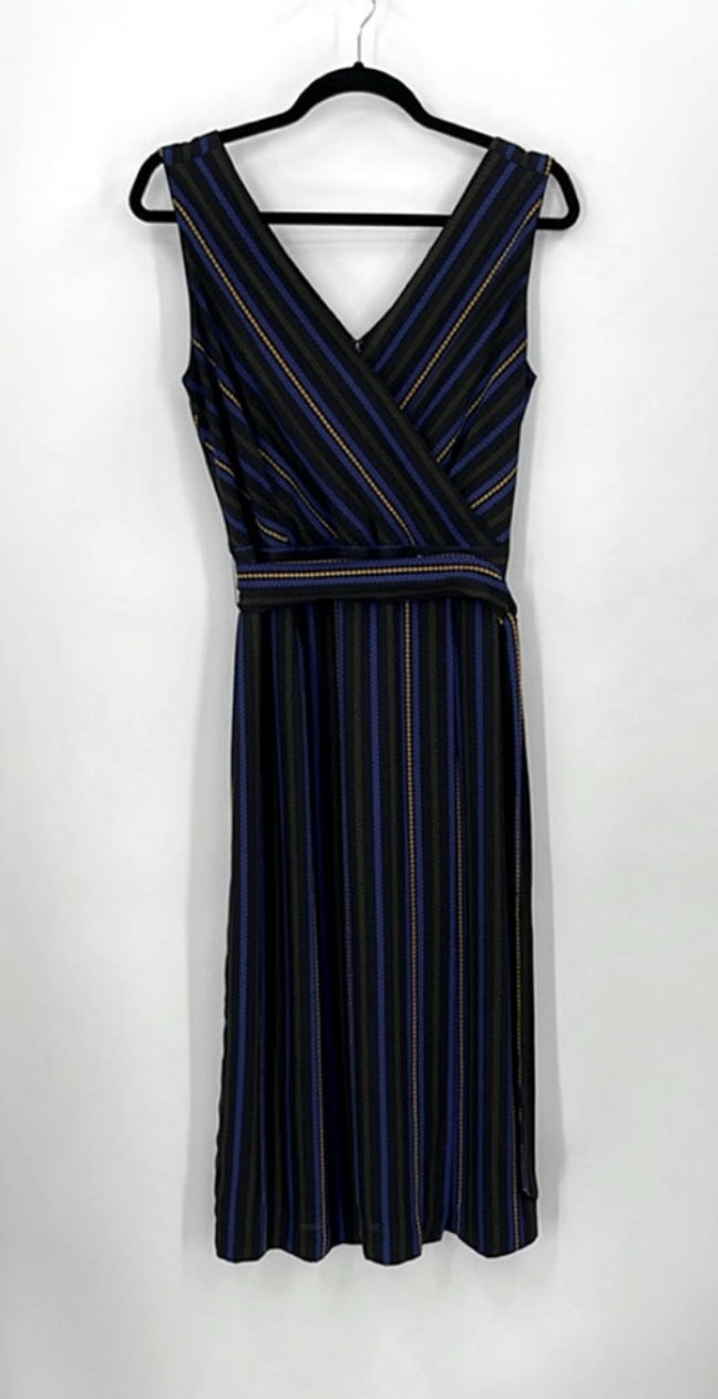 This dress features a V-neck and crossover top, with a striped pattern and a tie belt. It also has a back zipper and is fully lined with 100% polyester material. The size is 8, and approximate measurements include 19.5 inches pit to pit and a 45 inch length. The dress is in great pre-owned condition.