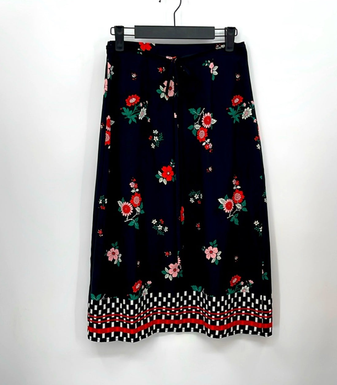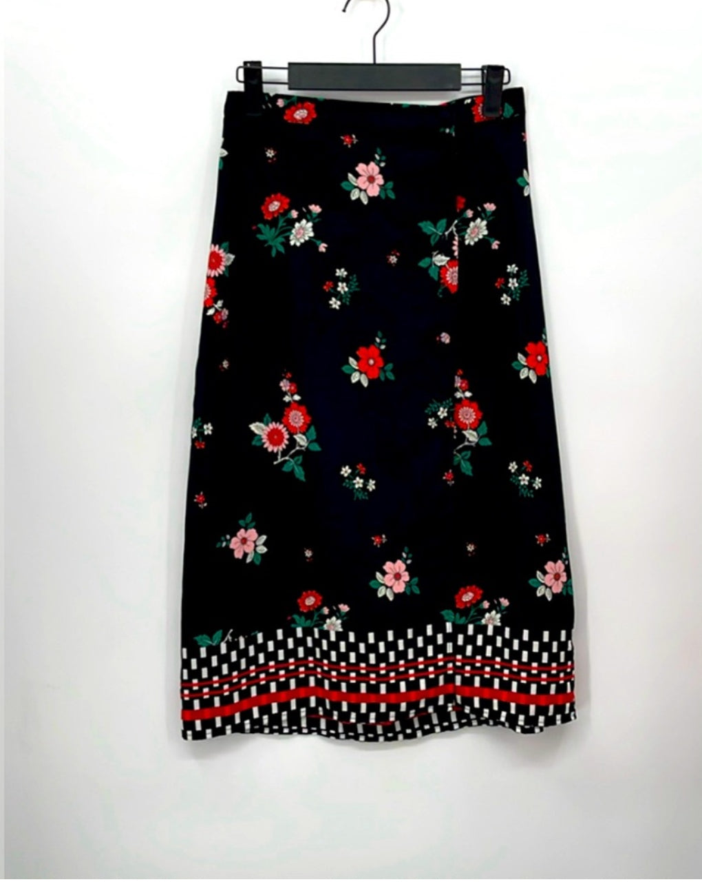 Crafted with a 100% polyester fabric, this TopShop Floral Skirt features a front button-up design and a versatile tie that can be styled at the front or back. Its flattering silhouette offers a waist measurement of 13 inches and a length of 26 inches, making it a perfect addition to your wardrobe. Expertly crafted, this skirt guarantees a good pre-owned condition for a classy and comfortable fashion statement.