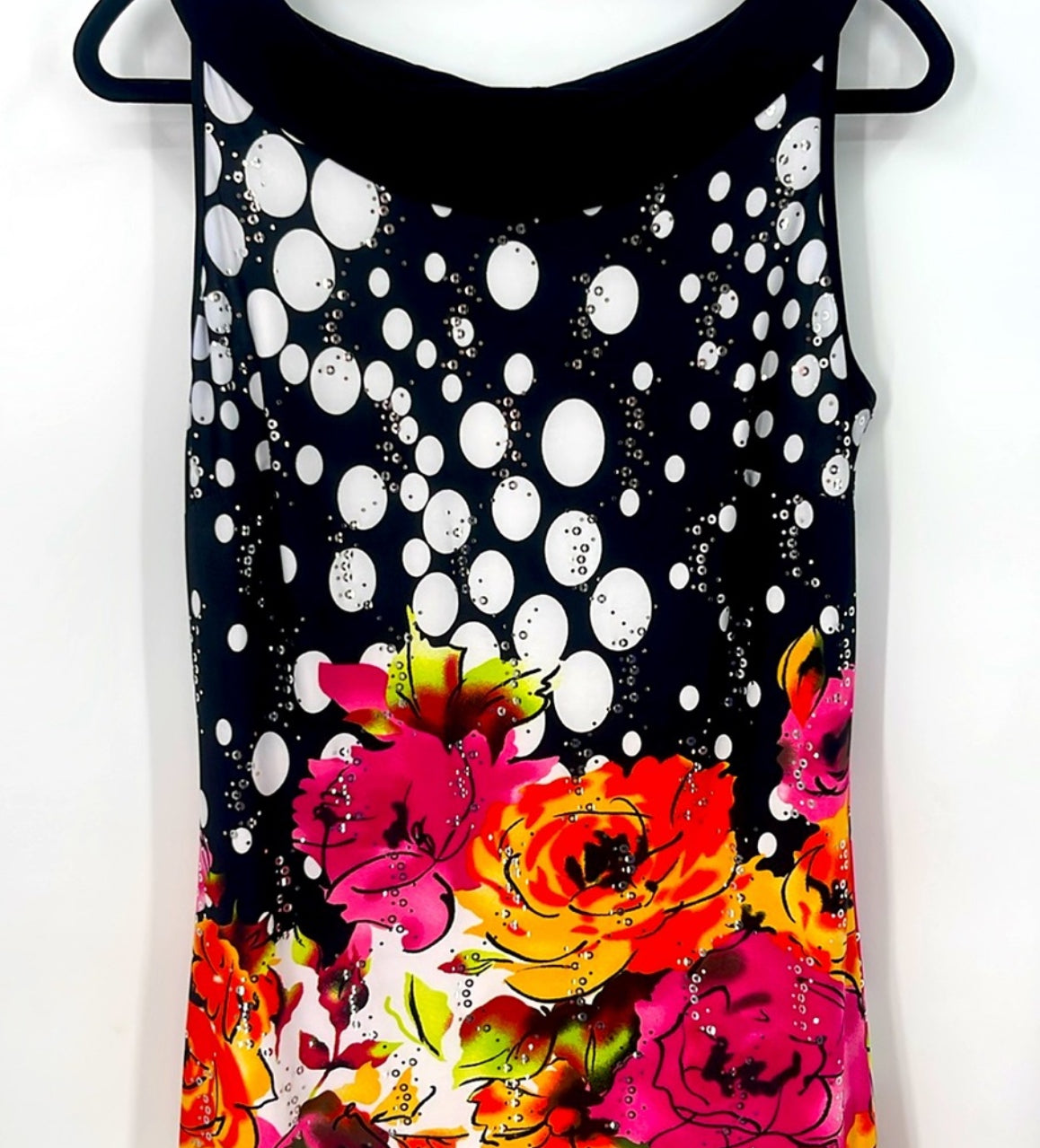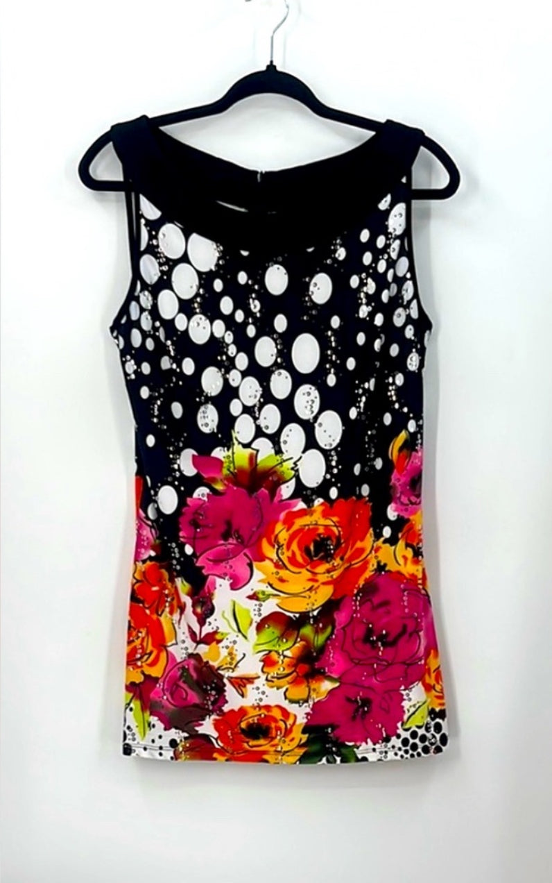 This tunic top boasts a sleeveless design adorned with a captivating abstract floral print. It features a back zipper and is fully lined for maximum comfort. Made of 95% polyester and 5% elastane, this top comes in a size 12 and has approximate measurements of 21 inches pit to pit (stretching to 23 inches) and a length of 30 inches. It is in great pre-owned condition.