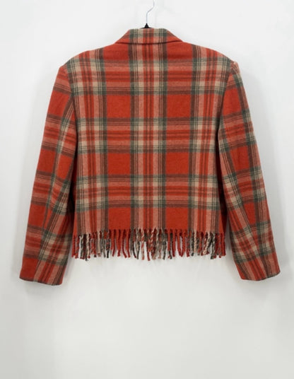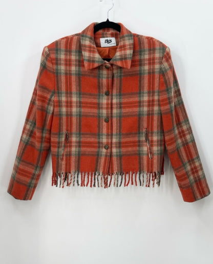 Plaid jacket by Canadian company BLU'S with fringe detailing. Perfect for adding a pop of color to your fall wardrobe Snap button enclosure Side zippered pockets