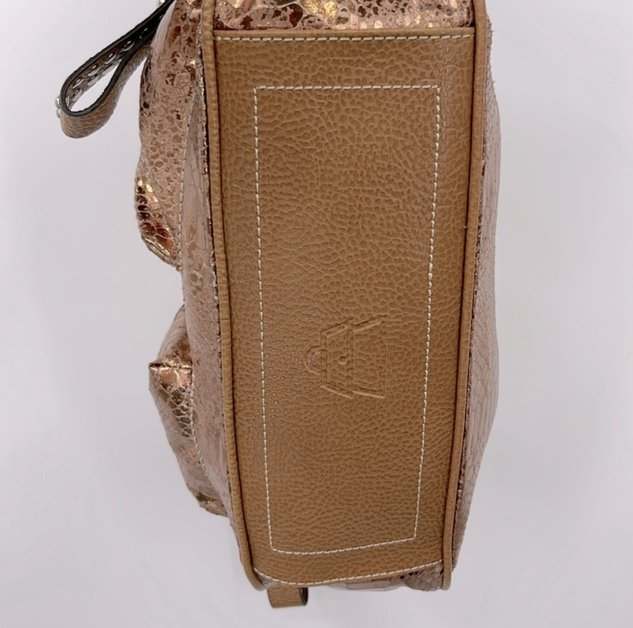 The Zippered closure provides secure storage for your belongings. The bag features a shiny gold animal print, with a front metal logo for a touch of elegance. In addition, there are front pouch zippered pockets adorned with studded straps, as well as an inside zippered pocket and two slip pockets. This Vintage Kathy Van Zeeland bag is in great pre-owned condition and measures approximately 11" in length, 6" in height, and 4" in width.