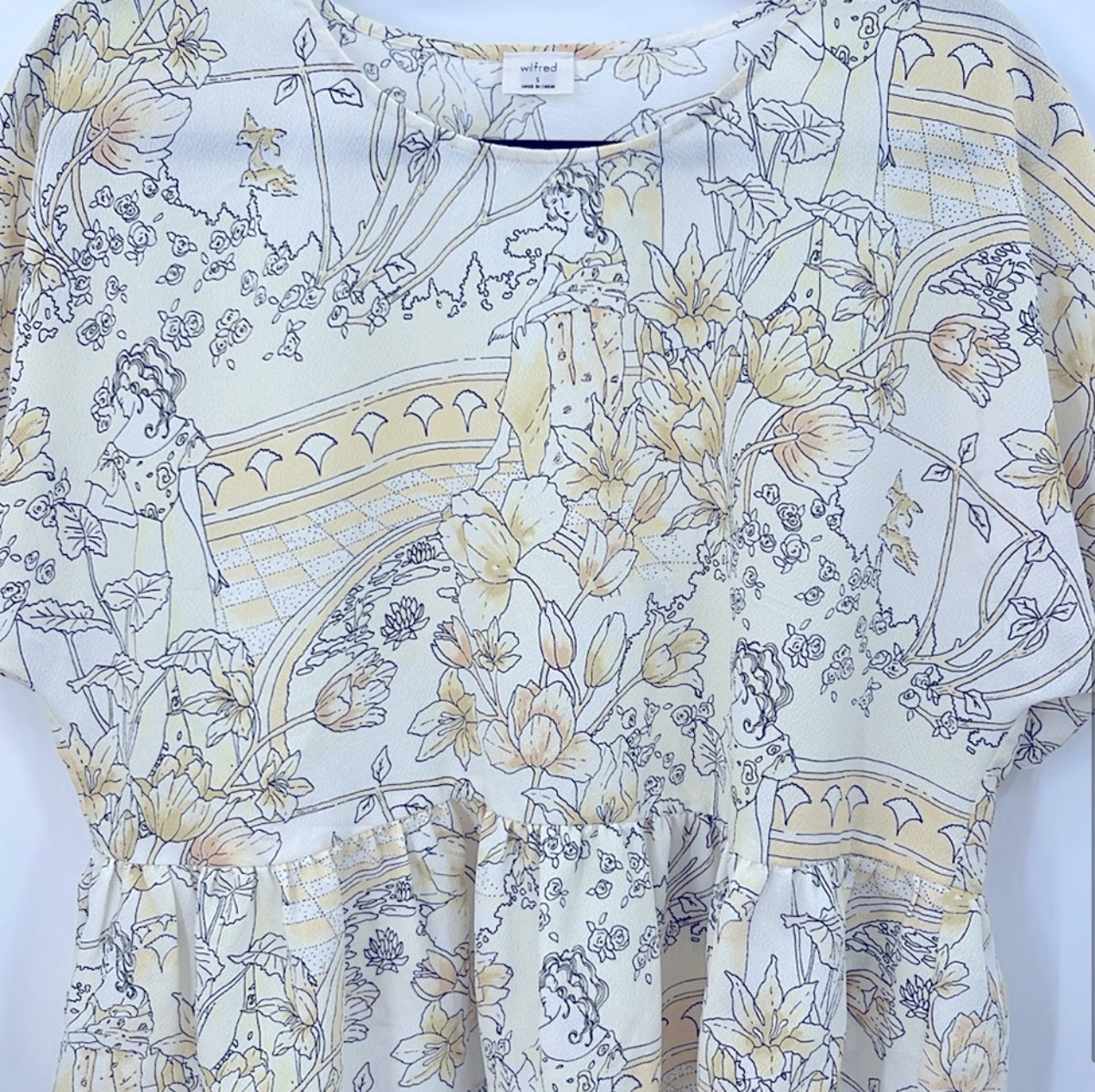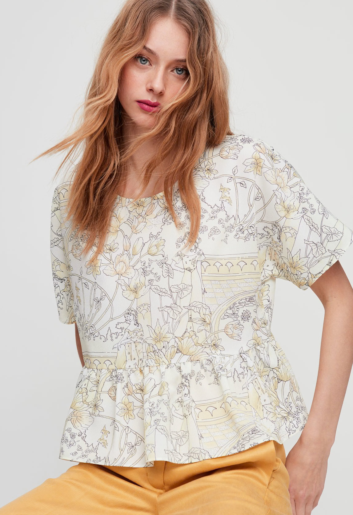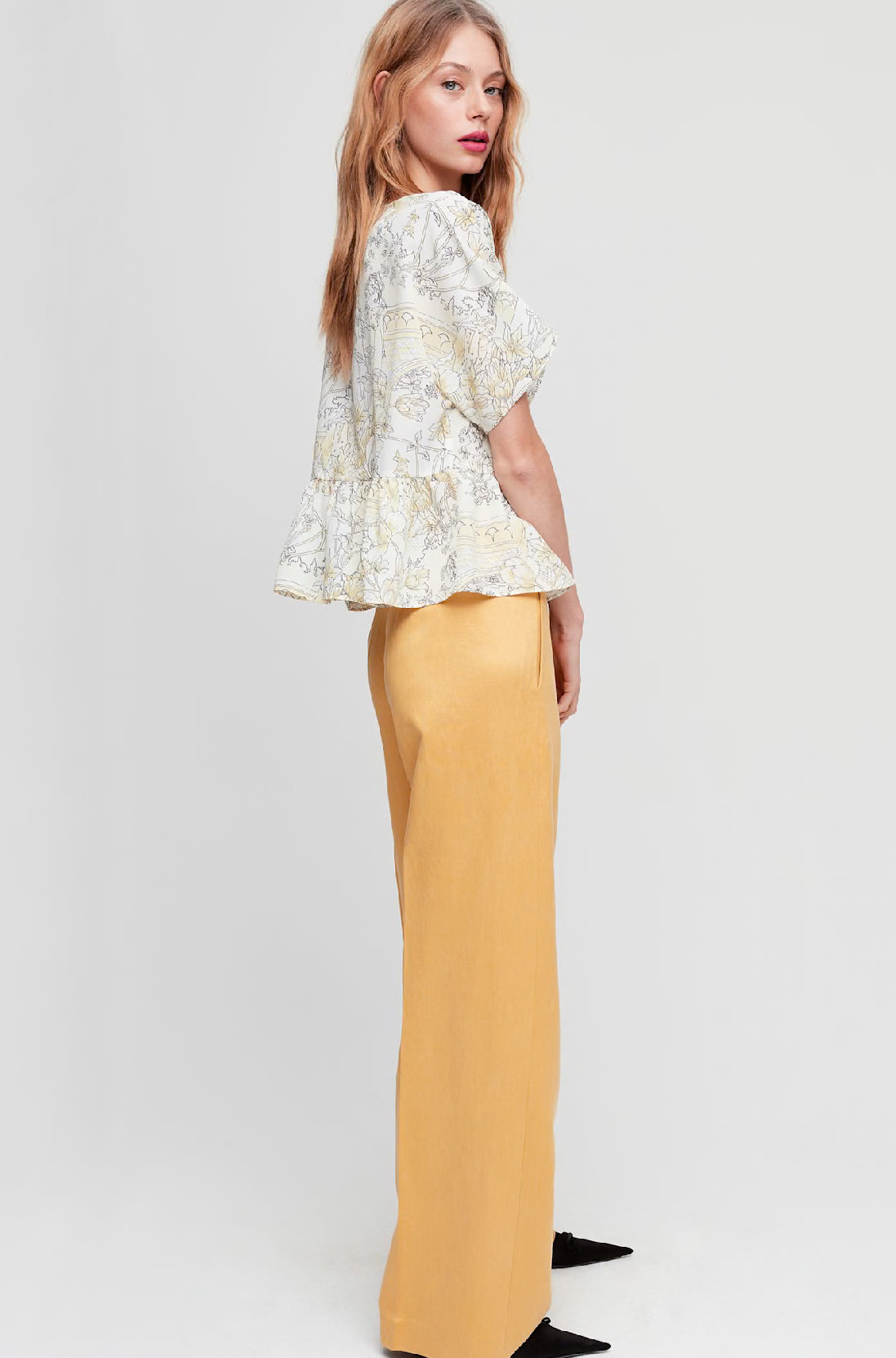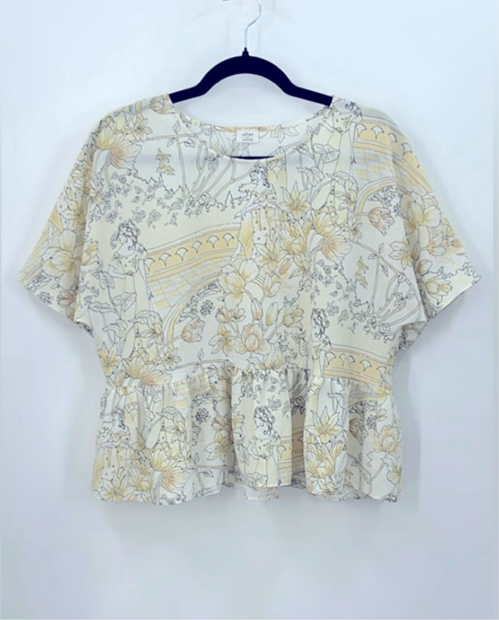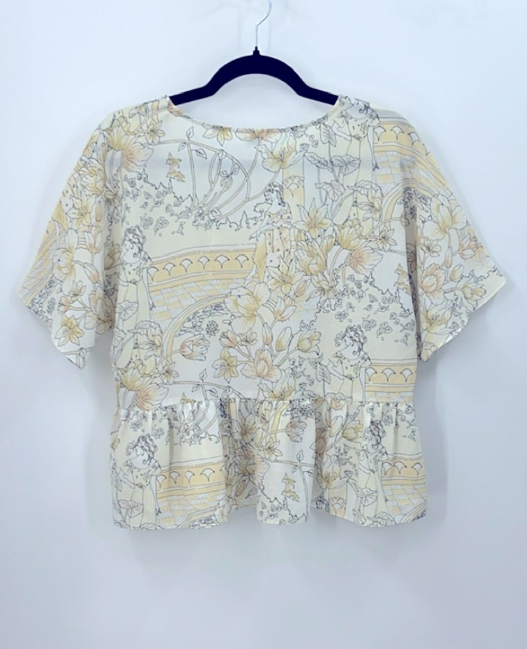 The Macee is a short-sleeve blouse with a peplum silhouette. This version comes in an exclusive hand-drawn print.