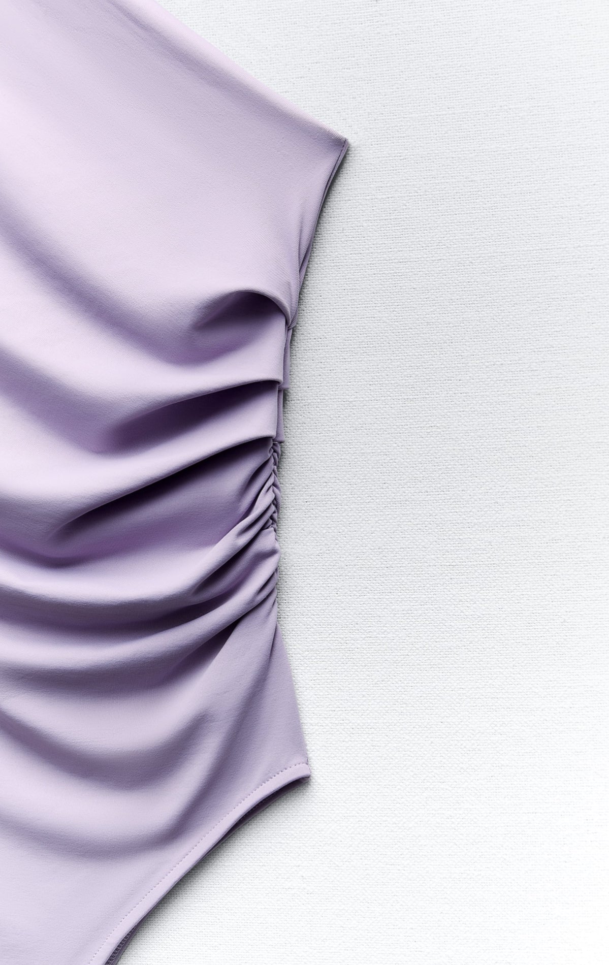 Expertly crafted, this sleeveless bodysuit features an asymmetric design and ruched fabric for a flattering silhouette. The bottom snap button closure ensures a secure fit. Made with 94% polyamide and 6% elastane, with 45% RCS-certified recycled polyamide in the outer shell.