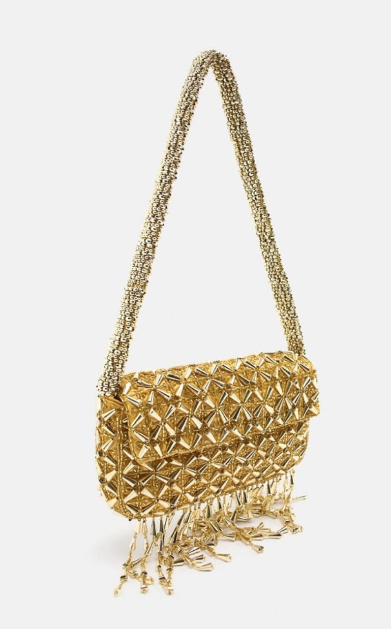 Discover a chic and versatile accessory with this Zara Beaded Fringe Purse. This elegant shoulder bag features beautiful beaded detailing and fringed accents, with a secure magnetic closure at the flap. The interior also includes a convenient slip pocket. Measuring 5.1 x 9.1 x 1.9 inches (13 x 23 × 5 cm), it's the perfect size for all your essentials. This purse is a must-have for any fashion-forward individual.