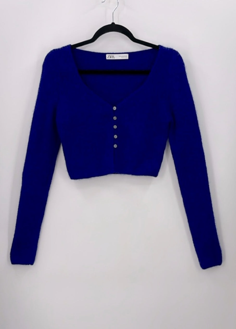 This cropped cardigan features a V-neck and a front button enclosure. It has long sleeves and is made from a blend of 47% acrylic, 34% polyester, 10% nylon, 5% elastane, and 4% wool. The size medium has approximate measurements of pit to pit 17 inches (stretching to 19 inches) and a length of 16 inches. The cardigan is in great pre-owned condition.