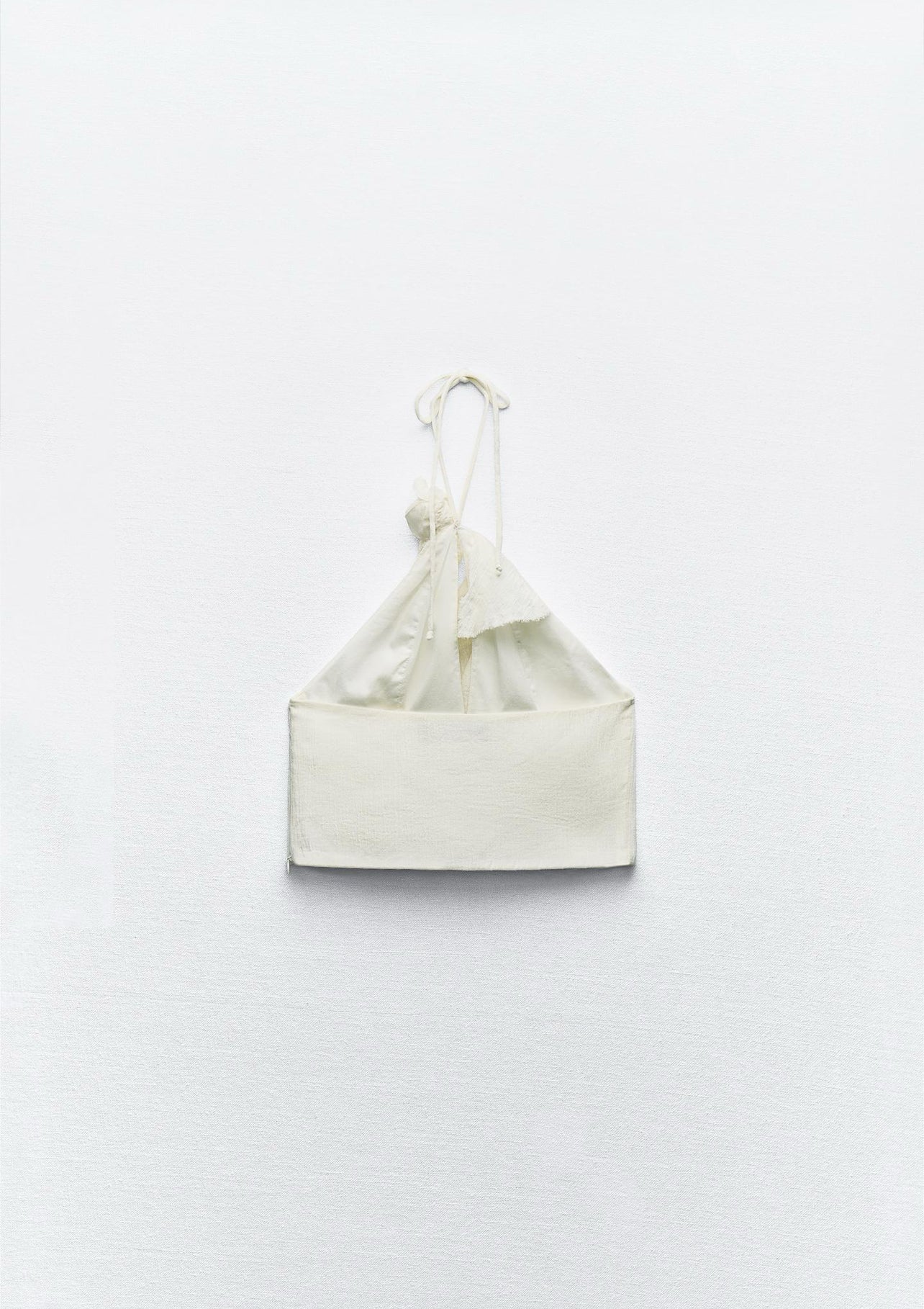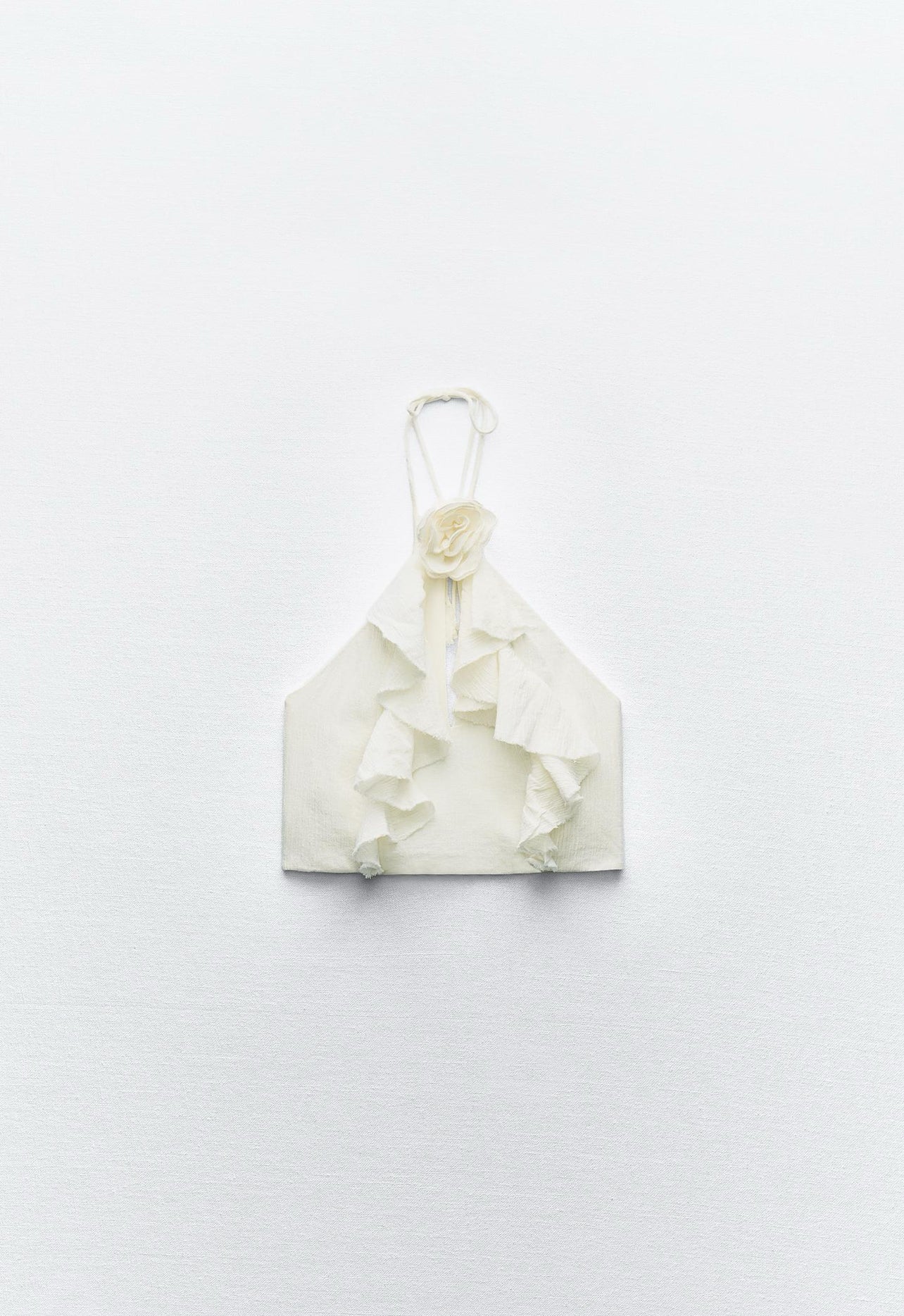 A versatile and stylish v-neck top with adjustable tie and open chest detail. Designed with textured floral detail and delicate ruffles. Features a hidden side zip closure for a seamless finish. Made with 86% cotton, 14% linen, and 0.5% polyester for the outer shell, and 100% cotton lining for comfort and breathability. Available in Ecru, product code 0881/053/712.
