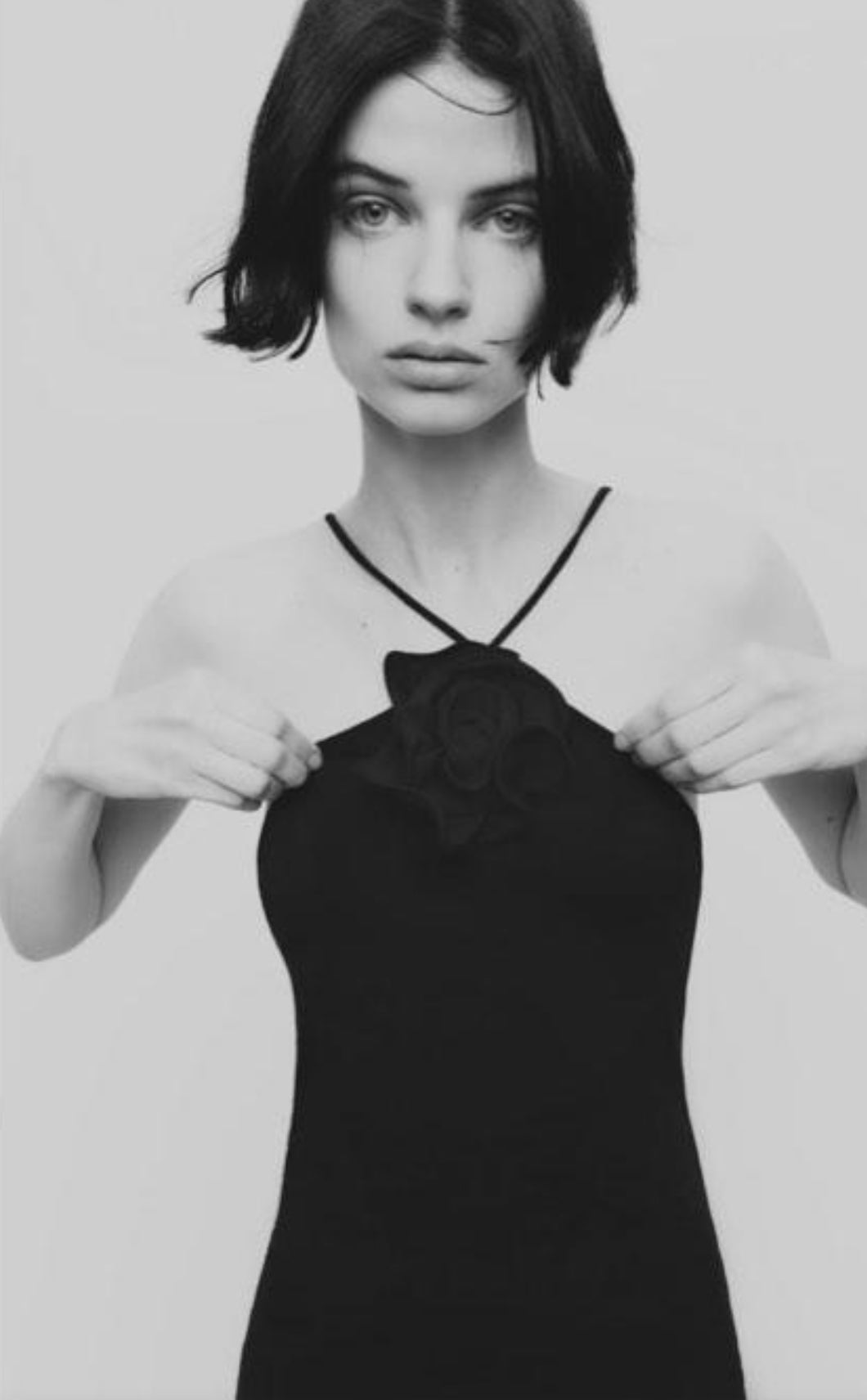 Mini halter dress with straps. Self raised floral detail. Body-con fit. Stretchy material